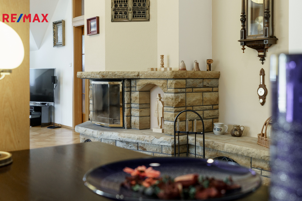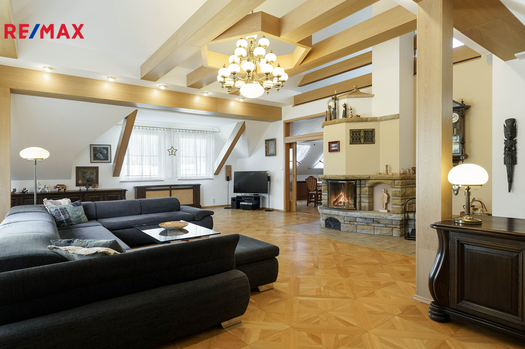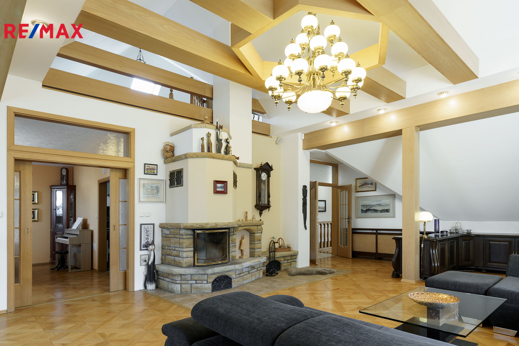 - velkorysý obývací prostor s krbem, vysokými stropy a vstupem na terasu