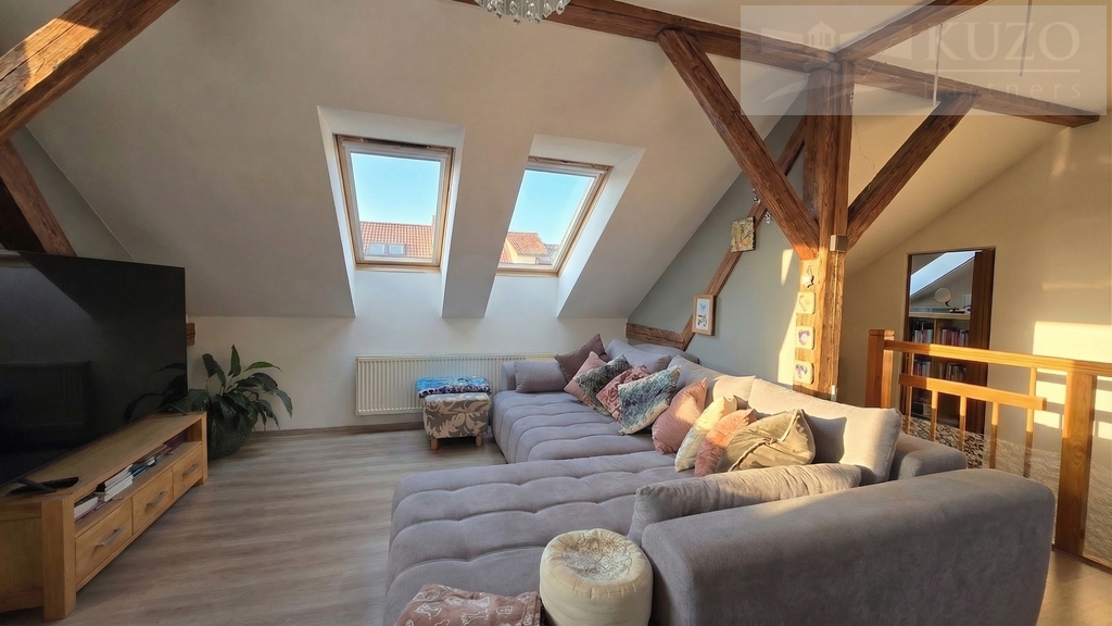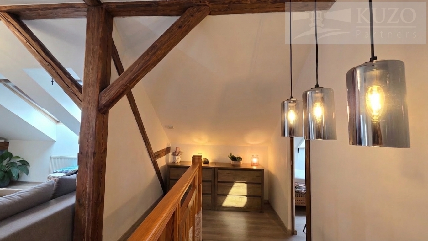 V patře najdete podkrovní obývací pokoj s přiznanými trámy, celkem 3 ložnice z toho dvě klasické ložnice (jedna s velkou šatnou) a jeden „kouzelný pokoj“. I když svými rozměry (pod 7 m²) nesplňuje tabulky pro ložnici, díky palandě je to nejoblíbenější místo pro hosty nebo dětské sny. Horní patro doplňuje druhá koupelna se sprchovým koutem a druhou toaletou.