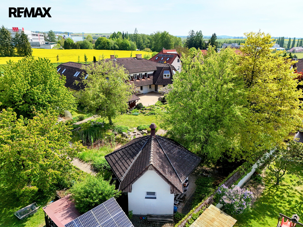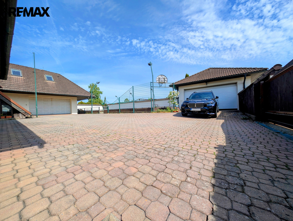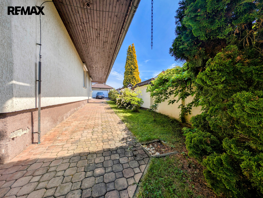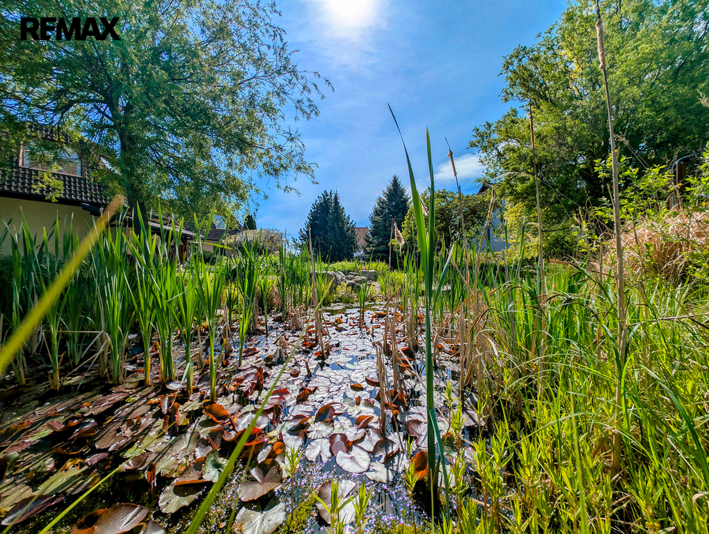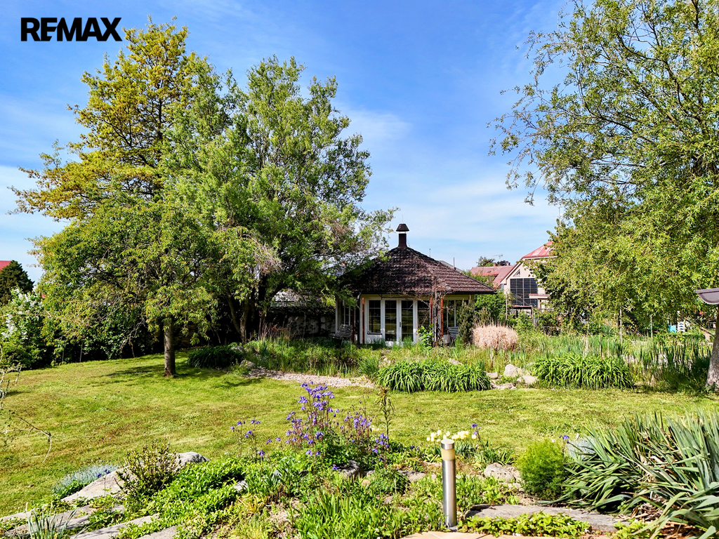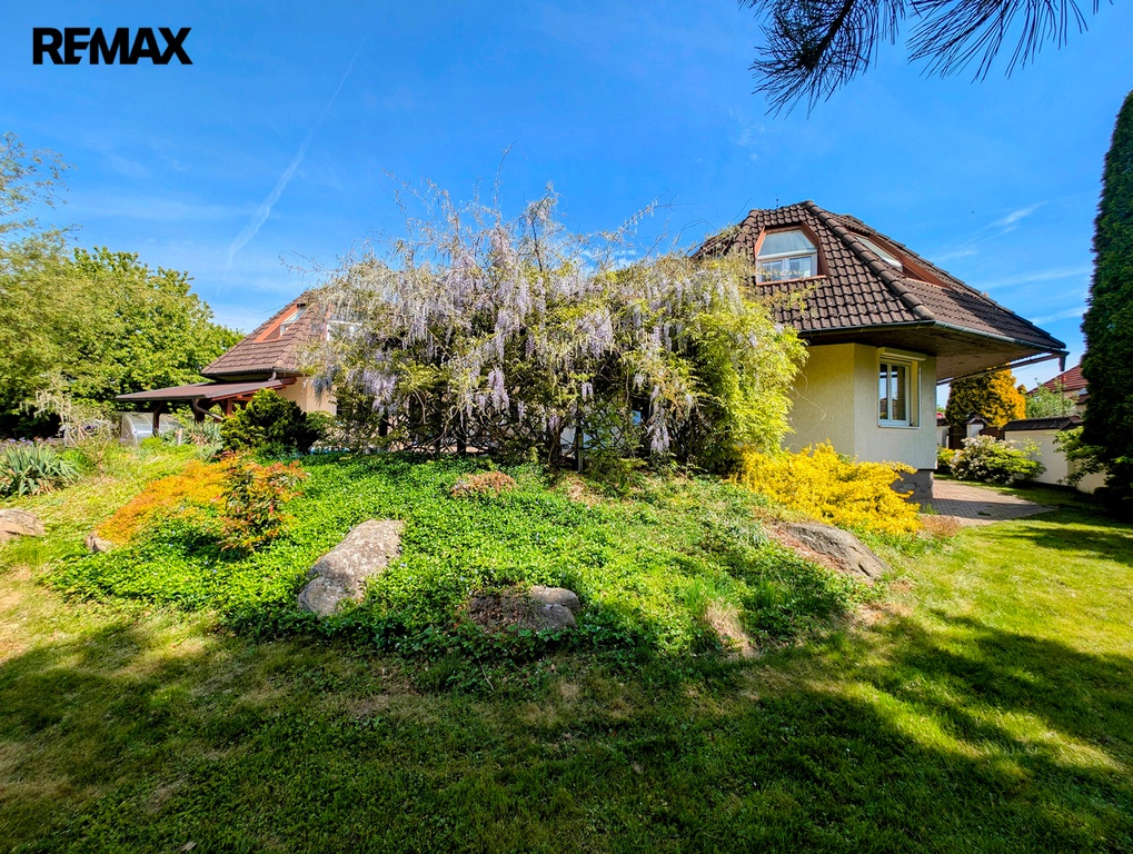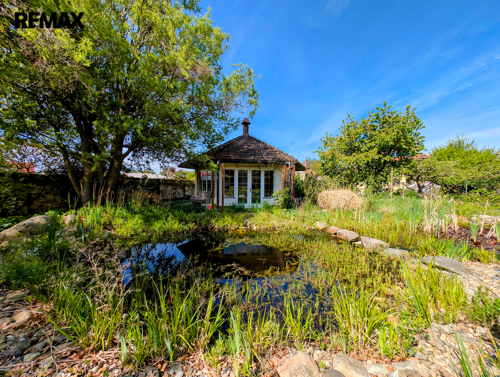 Z již zmíněné velké terasy, navazující od jihu k domu, pod kterou je z venčí přístupný cca 100 m2 velký vinný sklep s vinotékou, barem a WC, se dostaneme k zahradě. Ta je zatravněna, osázena okrasnými stromy a dřevinami a nechybí zde ani samozavlažovací, v zemi ukrytý, systém. Roh za malým jezírkem patří altánu, dnes jako letní kuchyně s centrálním ohništěm, barem a WC, zařízenému. Osvětlený tenisový kurt a dvě velké garáže základní výčet uzavírají. Snad ještě zmínit dvě vjezdové brány a vnitřní stání pro několik vozidel.
