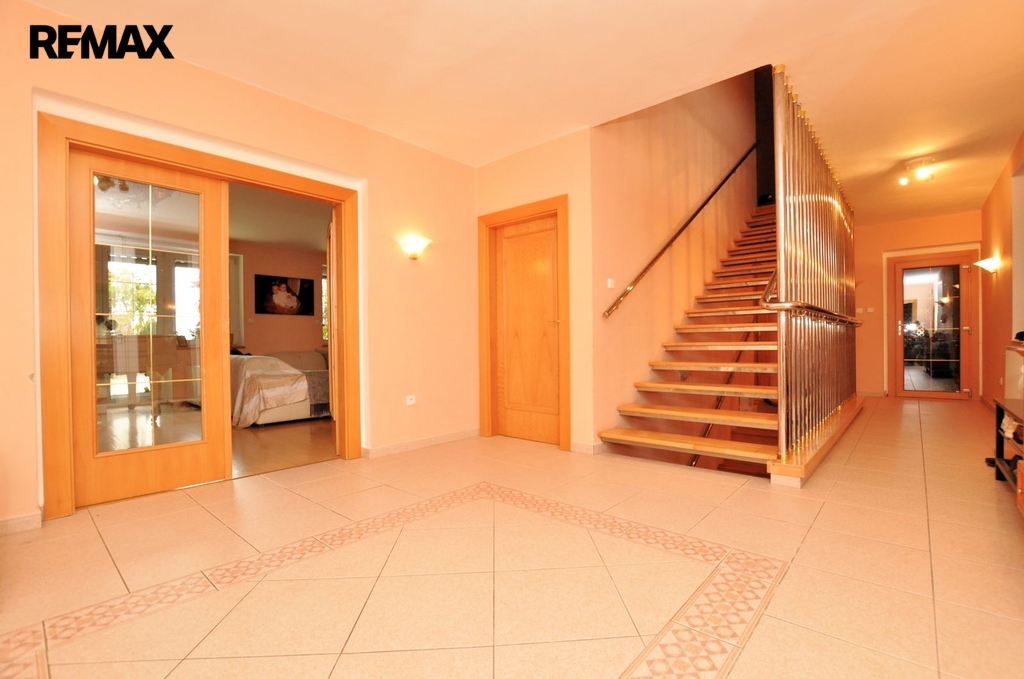 1.NP, přístupné z dlážděného dvora, je věnováno především společným a společenským aktivitám. Prostorná hala Vás přivede do denní místnosti a navazující kuchyně s jídelnou, vše s přístupem na velkou dlážděnou terasu, přecházející do zahrady. Byt pro hosty, s šatnou a koupelnou, vnitřní vyhřívaný bazén s protiproudem a úpravnou vlhkosti vzduchu, sociální zařízení a pozvolné, široké schodiště, propojující podlaží se suterénem a 2. NP, pak dotváří celé podlaží.