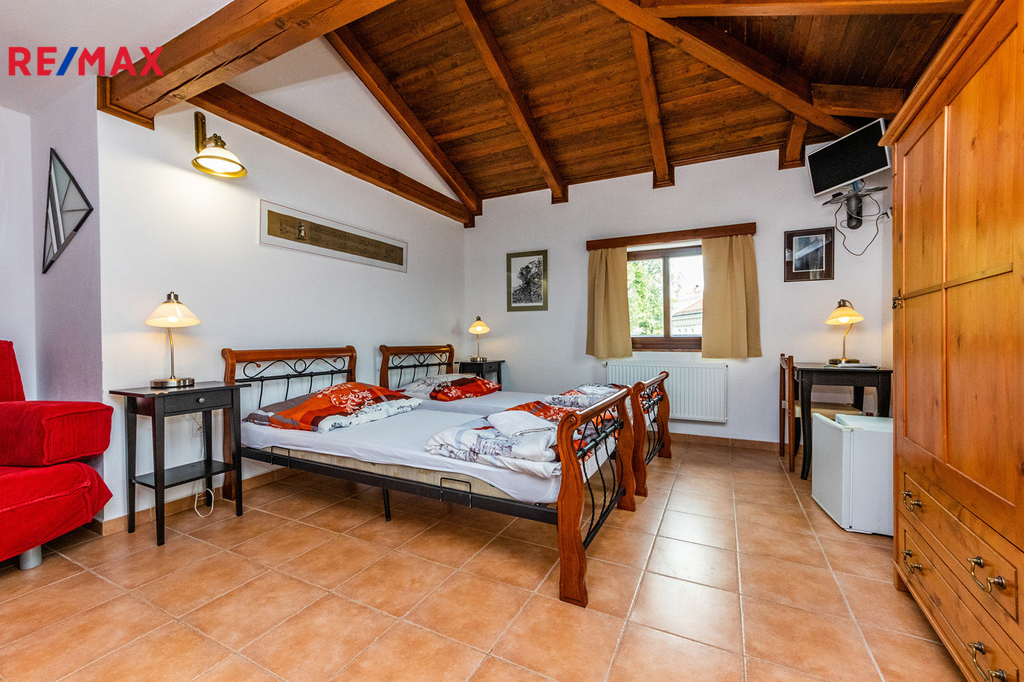 Penzion disponuje užitnou plochou 960m2, zahrnuje 15 pokojů s koupelnami, restaurací s kuchyní, zahradní restaurací se samostatným výčepem, dostatečným zázemím (sklady, sklepy na víno i pivo) + garáží. Dále dvěma byty 2+1 a 3+1, ke kterým patří zimní zateplená zahrada (pavlač) a také teresa o výměře 67m2 s bazénem s technologií na slanou vodu.