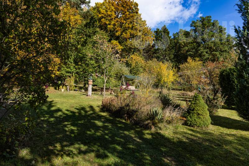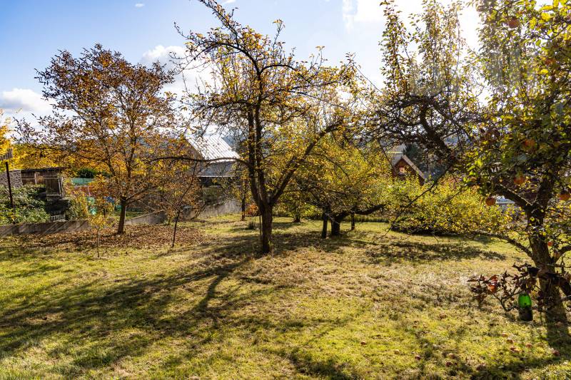 Vzrostlé ovocné stromy, užitkové i okrasné keře a další zeleň.