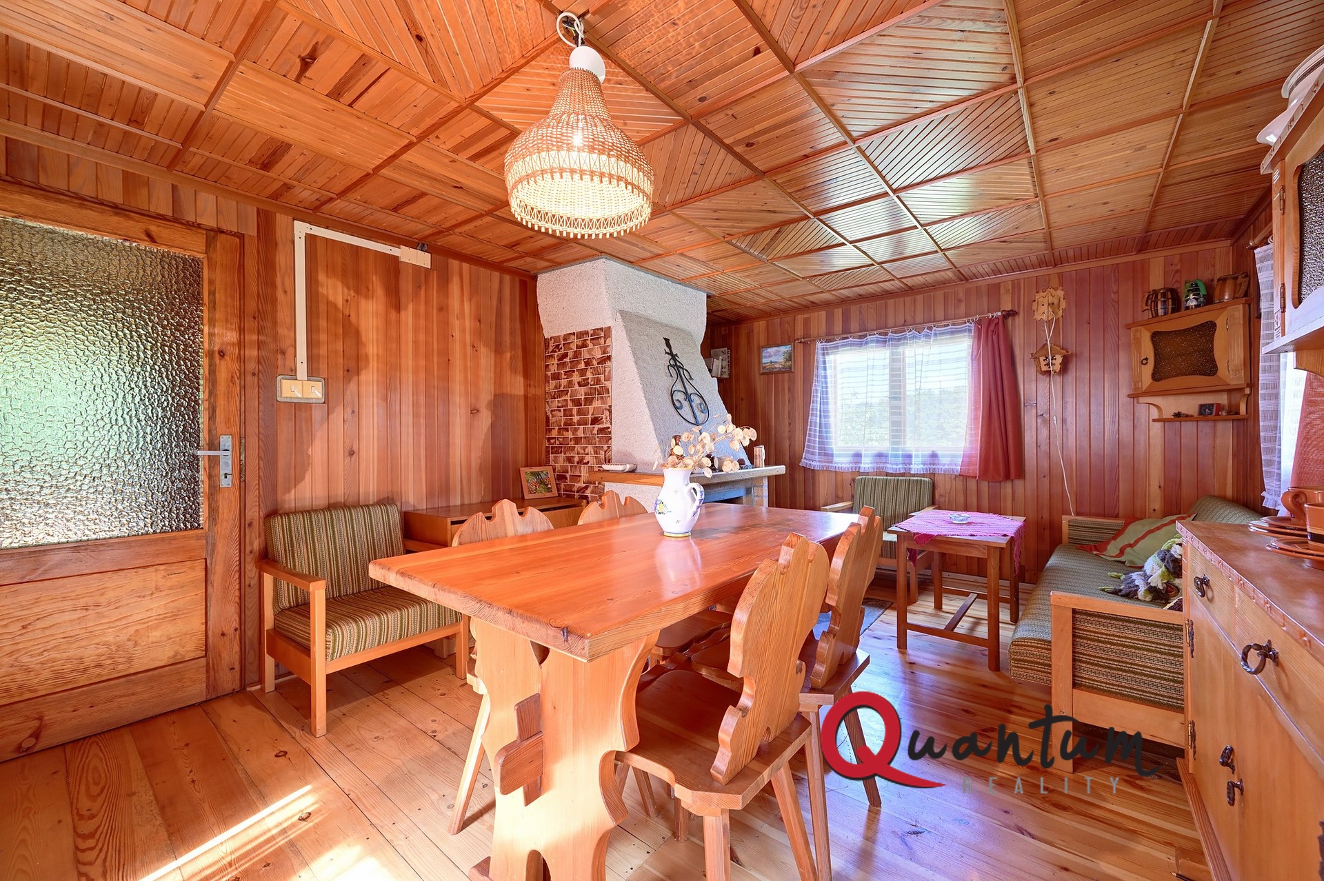 Dispozice hlavního obytného podlaží zahrnuje obývací pokoj (16,6 m²) s krbem, který zajišťuje vytápění celé chaty, a se vstupem na terasu s krásným výhledem do okolní krajiny. Dále je zde kuchyň, ložnice (8,2 m²), menší pokoj (4,4 m²), předsíň, vstupní závětří a schodiště do suterénu. Ve spodním podlaží se nachází koupelna s toaletou a bojlerem na ohřev vody, dva další pokoje využitelné jako obytné či hostinské, sklad pod schody, chodba a již zmíněná garáž.
