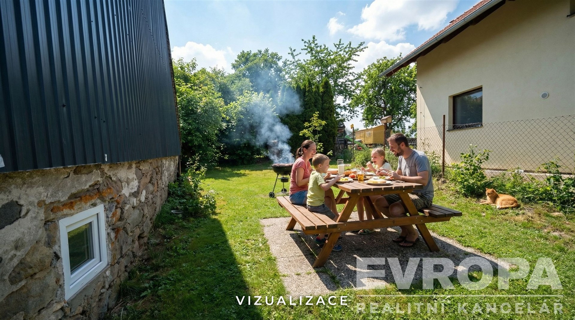 Před domem jsou 2 parkovací místa a malá předzahrádka, za domem je menší oplocená zahrada obdélníkového tvaru.