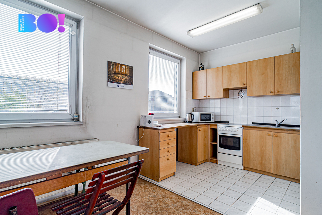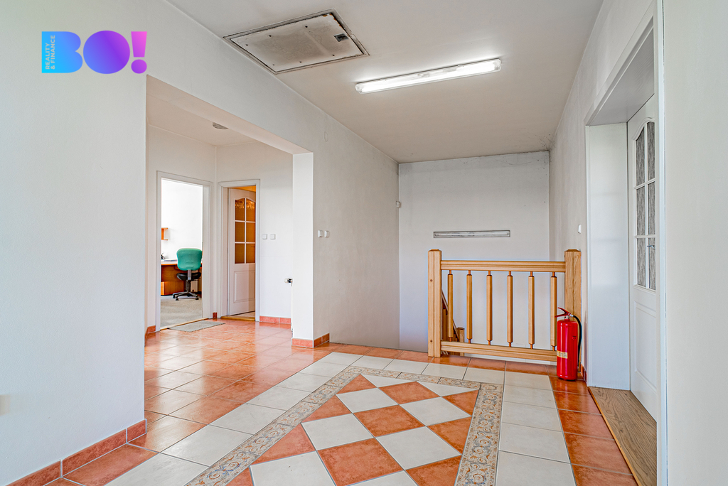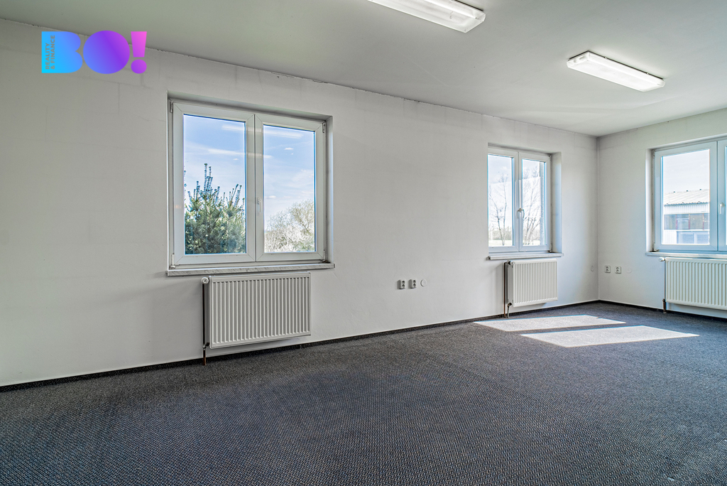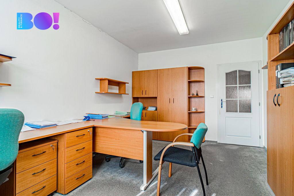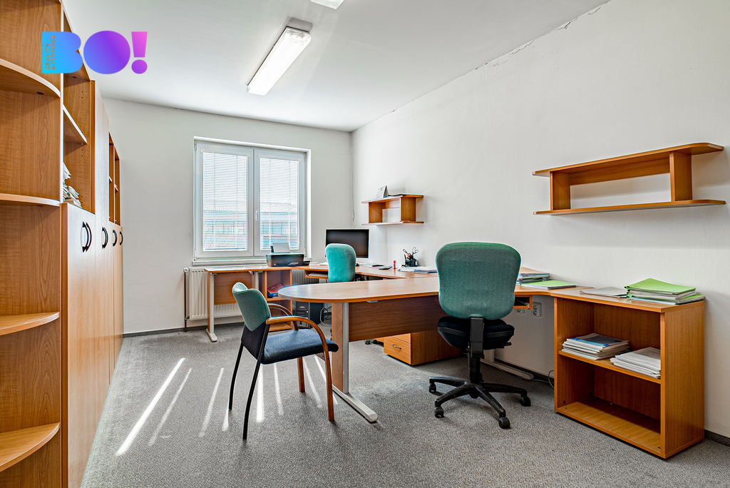Administrativní dvoupodlažní budova s kancelářemi a jednacími místnostmi je udržovaná, k dispozici je sociální zařízení a je zde možnost vybudování minimálně jednoho bytu.