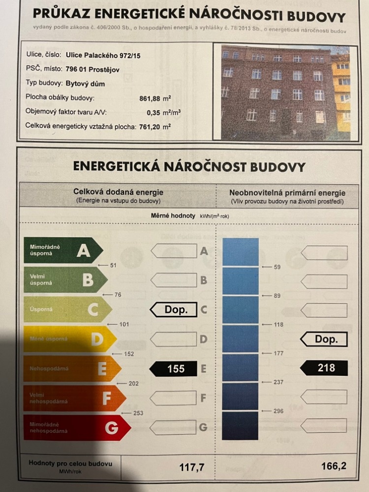 - Ukazatel energetické náročnosti budovy: 155 kWh/m²