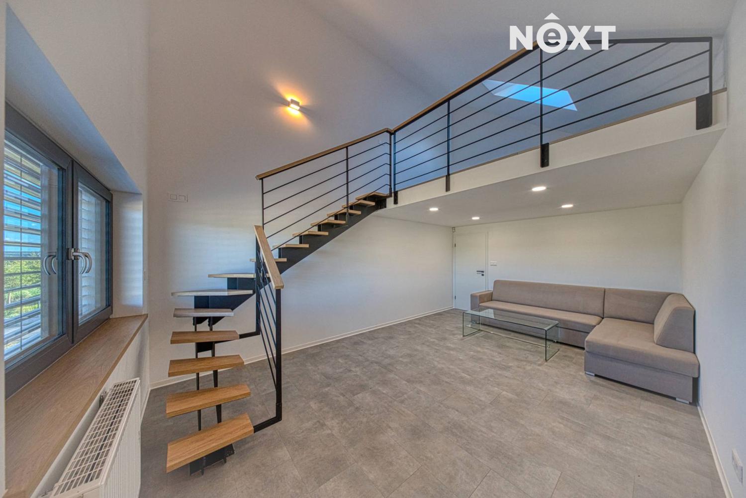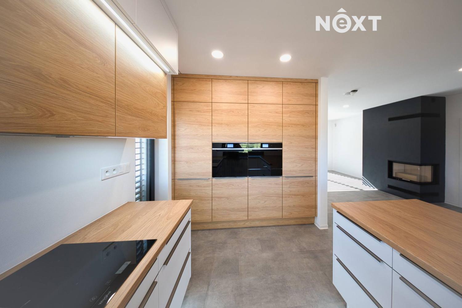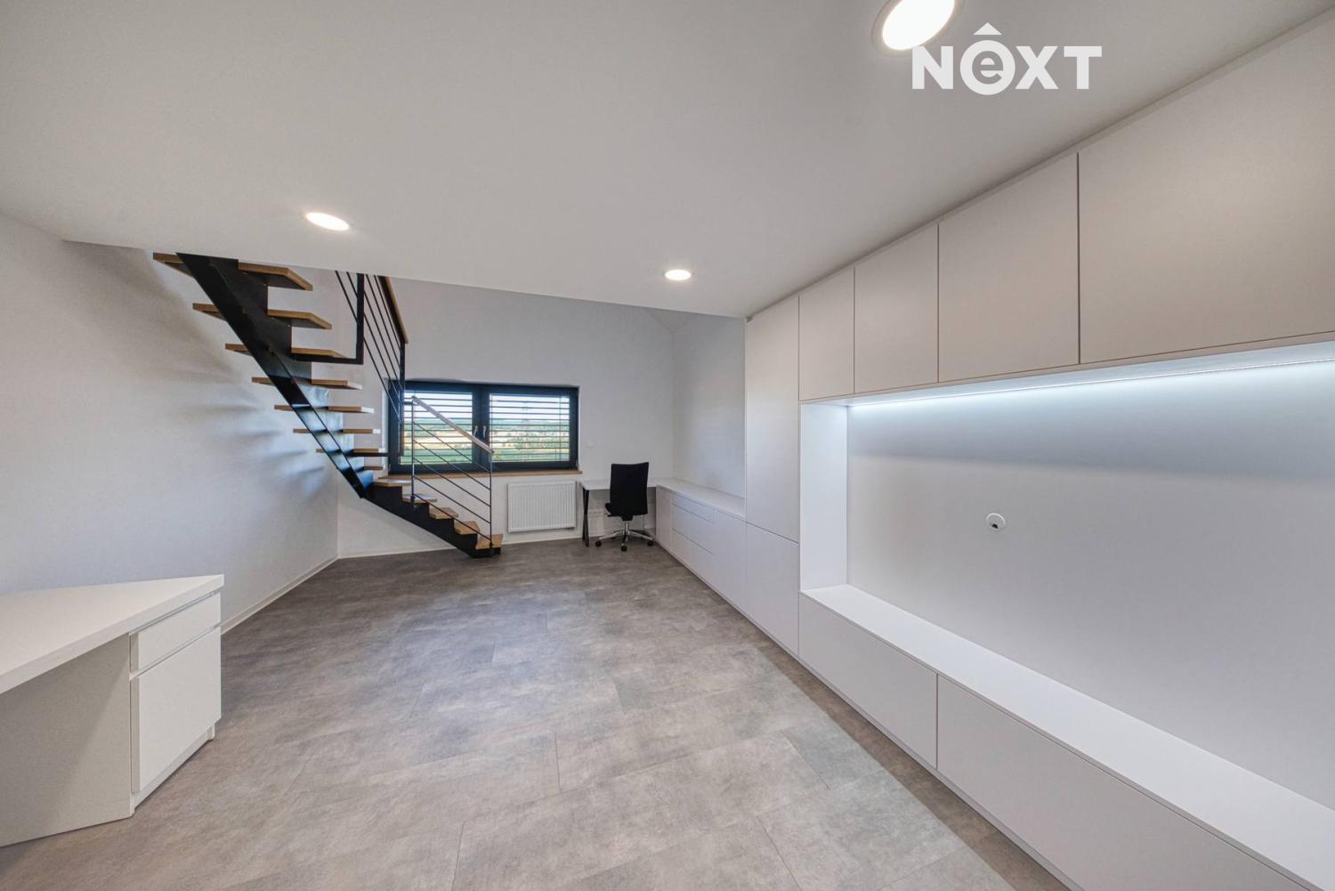 První nadzemní podlaží: útulný obývací pokoj s krbem, propojený s kuchyní a jídelnou, s přímým vstupem na terasu a zahradu přes velkoformátové HS portály. Ložnice s vlastní šatnou, dva designově řešené pokoje s mezipatrem pro spaní – jeden z nich se šatnou, pracovna, prostorná koupelna s WC, samostatné WC a chodba s vestavnou skříní.