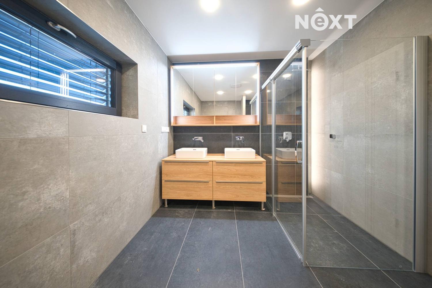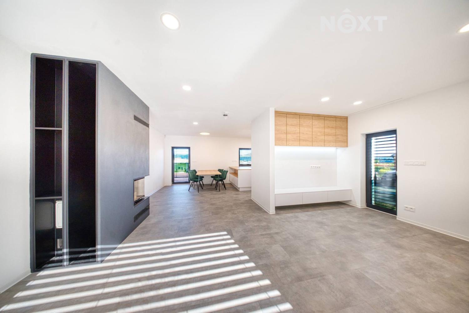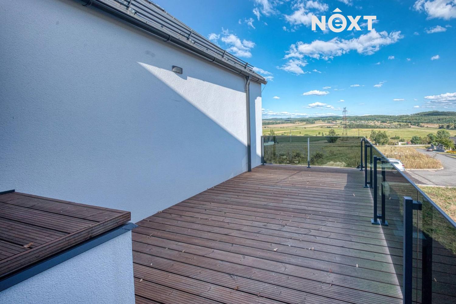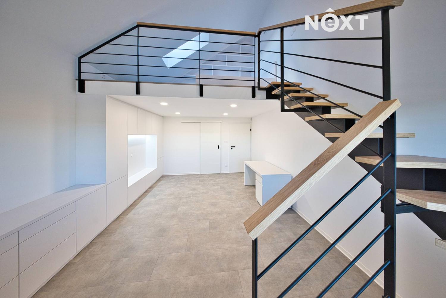 První nadzemní podlaží: útulný obývací pokoj s krbem, propojený s kuchyní a jídelnou, s přímým vstupem na terasu a zahradu přes velkoformátové HS portály. Ložnice s vlastní šatnou, dva designově řešené pokoje s mezipatrem pro spaní – jeden z nich se šatnou, pracovna, prostorná koupelna s WC, samostatné WC a chodba s vestavnou skříní.