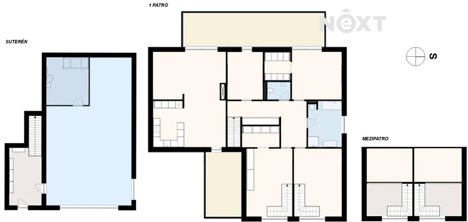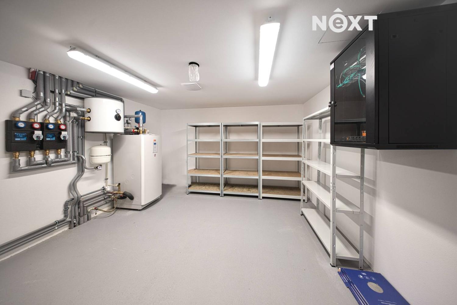 Suterén: vstupní hala s šatnou, prostorná garáž pro více osobních automobilů a technická místnost s tepelným čerpadlem (vzduch–voda).