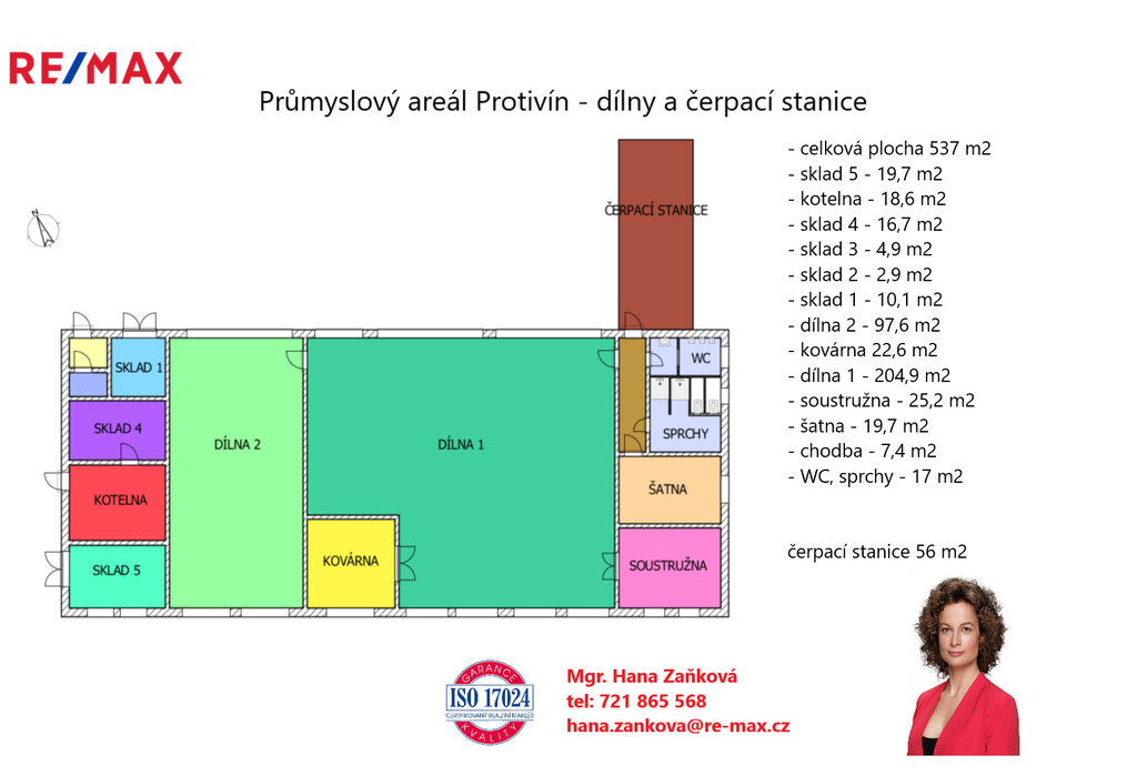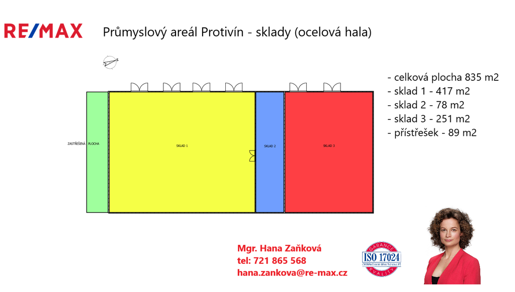 C- skladů (zastavěná plocha 754 m2) s výškou stropu 8,3 m, šesti vjezdy ocelovými vraty (výška 3,3 m, šířka 3 m) a zastřešenou plochou 89 m2. Jedná se o budovu tvořenou ocelovou konstrukcí napojenou na elektřinu, 360 V.
