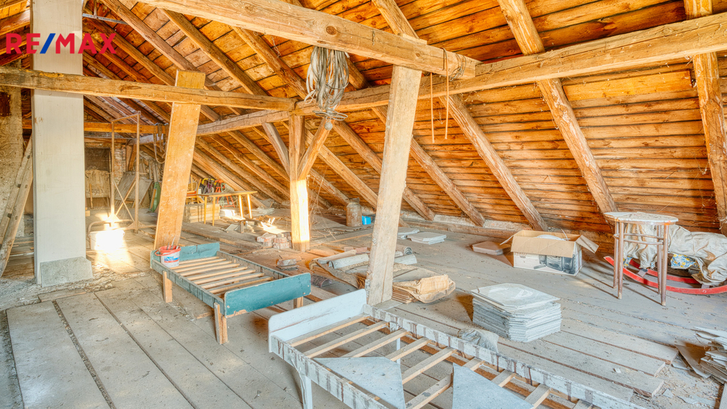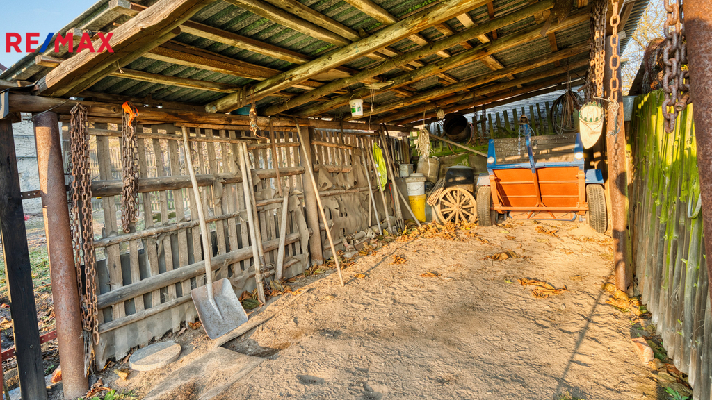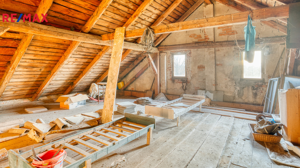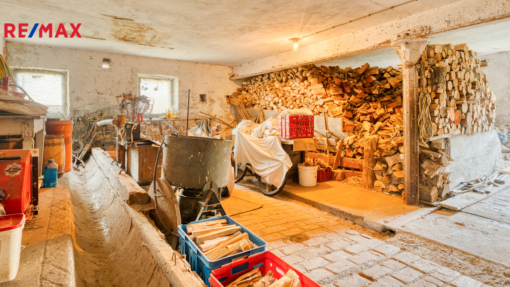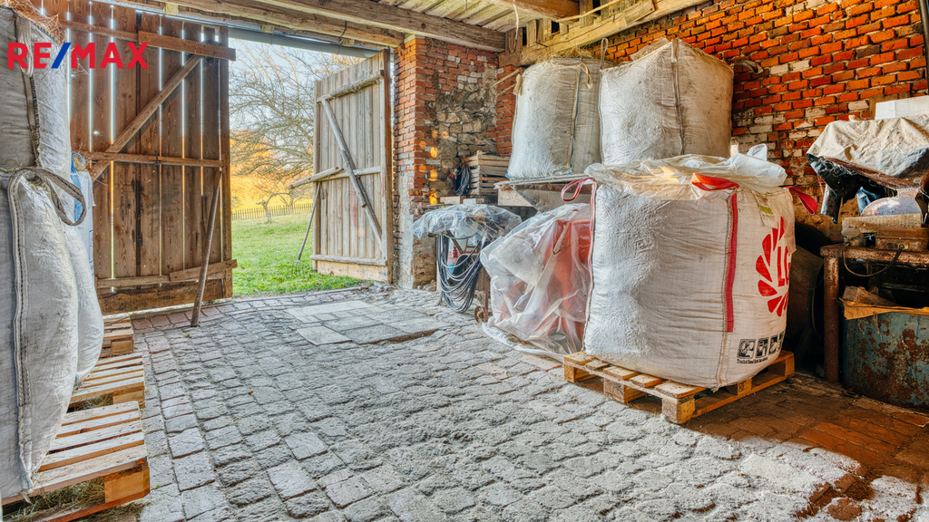 Na dům bezprostředně navazuje velká stodola a další hospodářská část, která tvoří s domem praktický celek. Ve stodole je dostatek prostoru pro uskladnění dřeva na topnou sezónu, parkování techniky, čtyřkolek či zahradních strojů, a zároveň zde najdete klasický seník. Své místo tu může mít i dílna, prostor pro drobné hospodářství nebo kryté stání pro auto. Díky výšce a členění stodoly je zde také potenciál pro případné další využití – např. ateliér, domácí zázemí pro koníčky či sklad pro menší podnikání.