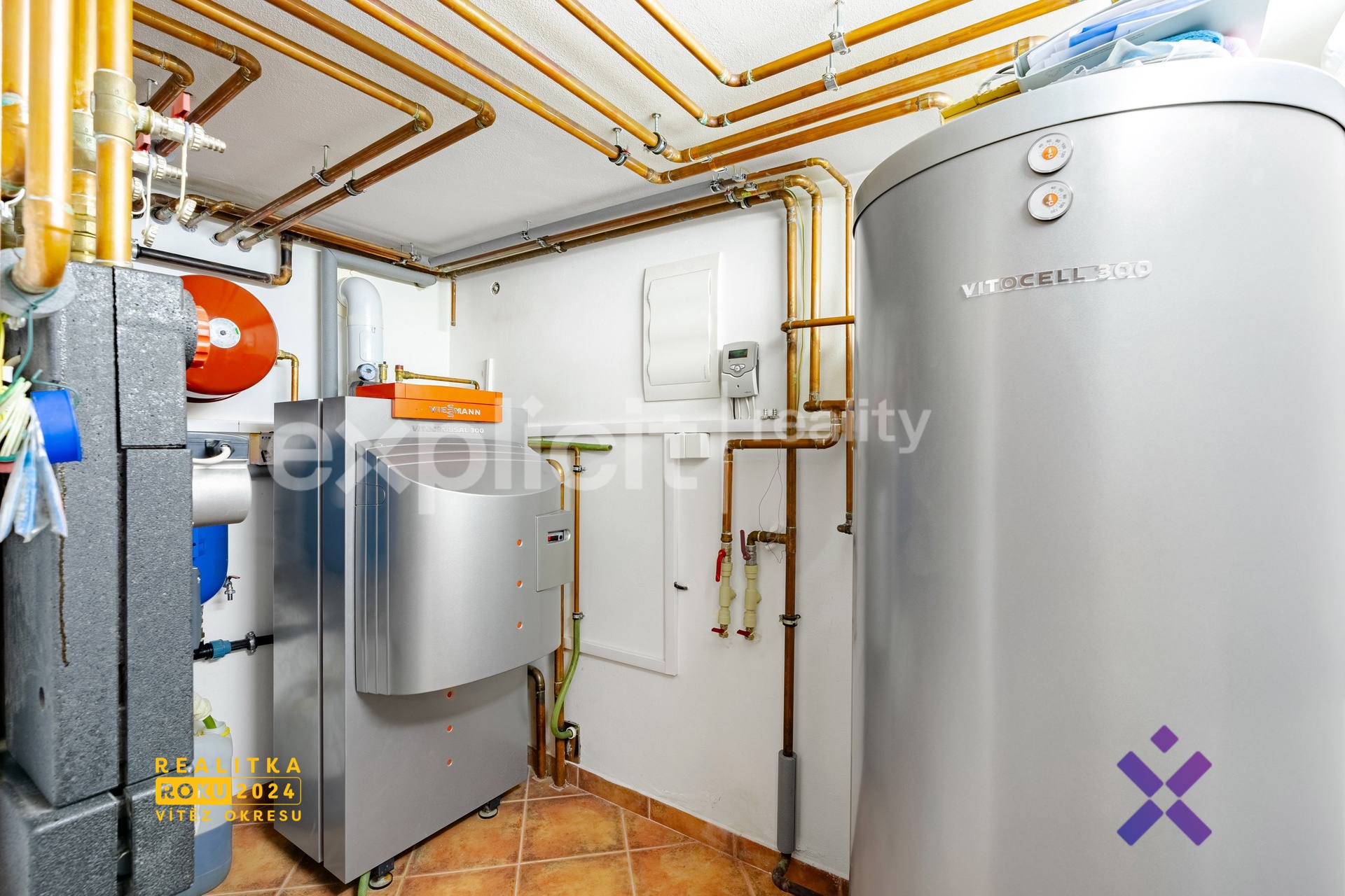 Dům nabízí také obytný suterén se samostatným vstupem, který je plně vytápěný a obyvatelný. Najdete zde stylovou společenskou místnost s velkým stolem a židlemi vhodnou pro rodinné oslavy, jako vinotéku nebo hernu. Na společenskou místnost navazuje kuchyňka s dřezem, troubou, indukční varnou deskou a lednicí. Součástí suterénu je rovněž chodbička s umyvadlem, samostatné WC a technická místnost.
