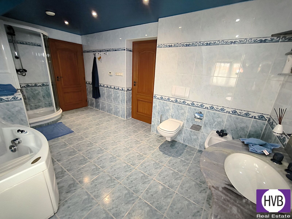 Dispozice domu zahrnuje rozlehlý obývací pokoj se vstupem na terasu a k bazénu, jídelnu, kuchyni, halu, posilovnu, saunu, technickou místnost, sociální zařízení a dvougaráž. V prvním patře se třemi klimatizačními jednotkami se nachází 3 pokoje, šatna, chodba a koupelna se soc. zařízením .
