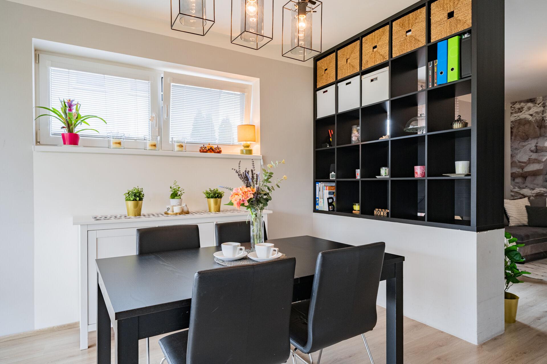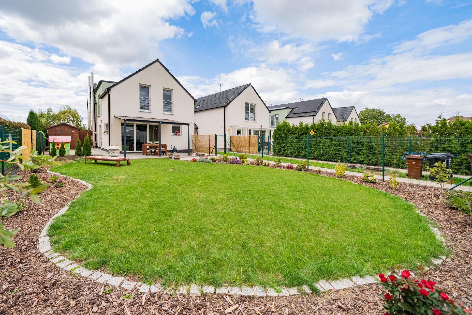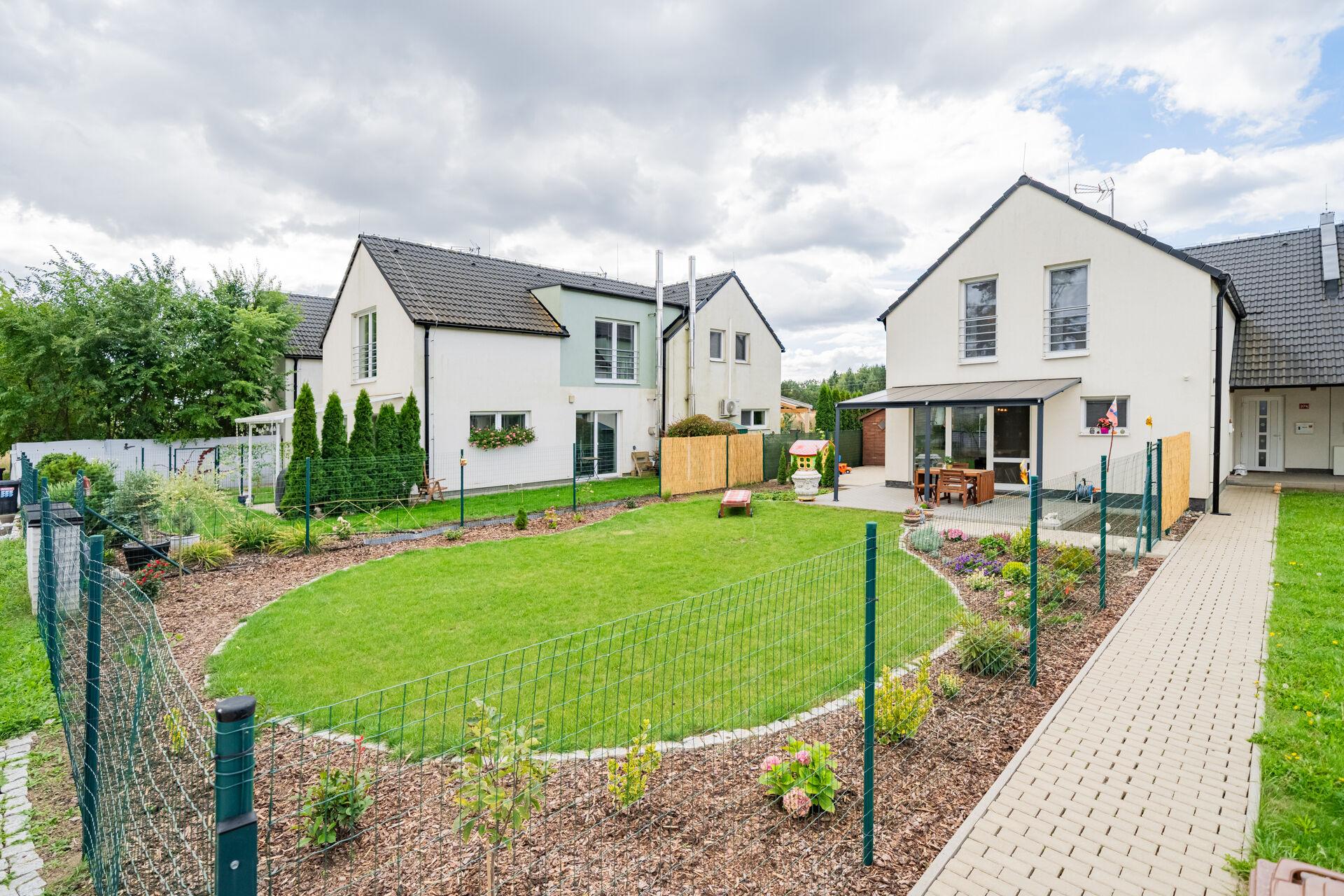 Obývací pokoj v přízemí domu s přímým vstupem na terasu a dále do zahrady, je moderně propojený s kuchyní. Ta je vybavena kuchyňskou linkou na míru se spotřebiči a je zde praktická úložná komora. V přízemí bytu je také vstupní chodba a toaleta. V patře domu jsou dva pokoje, krásná ložnice a druhý pokoj, který je v současné době rozdělen na dva, dětský pokoj a pracovnu. Koupelna je s vanou a toaletou, nechybí připojení na pračku. Topení je řešené elektrickým kotlem. Okna jsou plastová se žaluziemi. Velkou výhodou bytu je klidné bydlení, již zmiňovaná krásná, rovinatá zahrada a skvělá dostupnost Prahy či blízkých Hostivic. Parkování je pohodlné před domem.