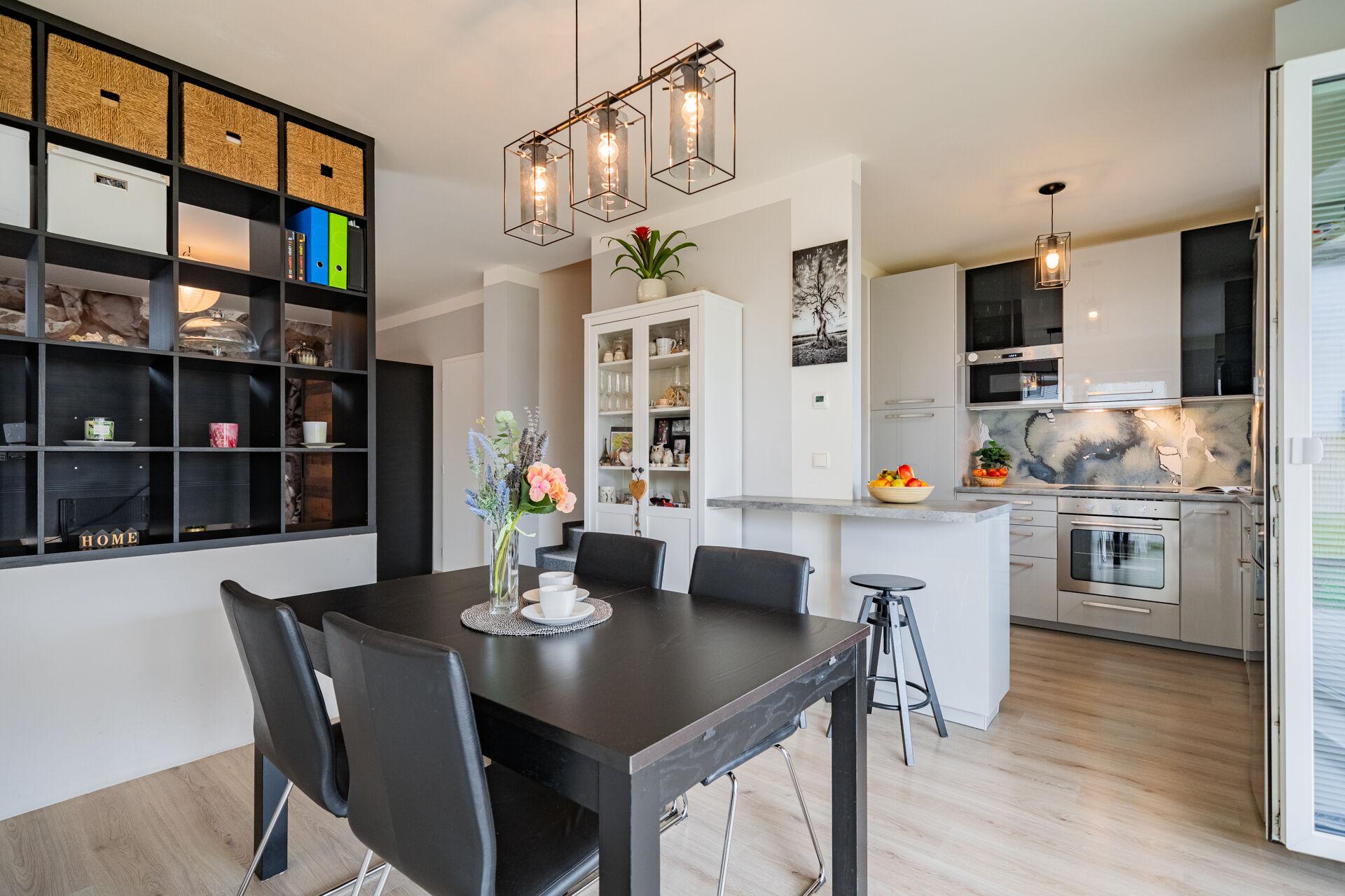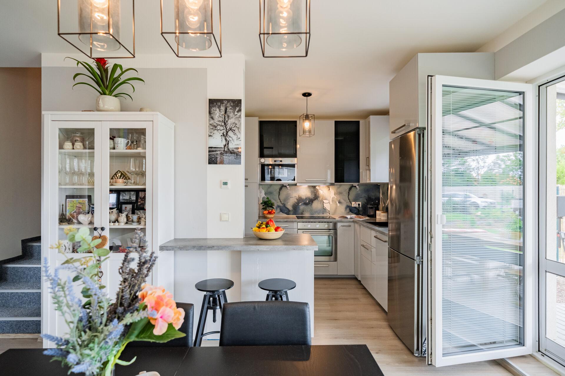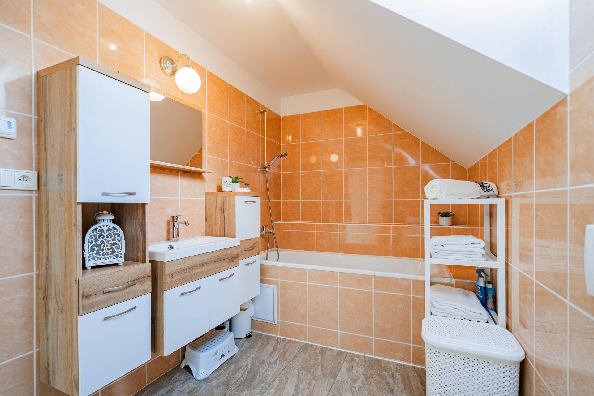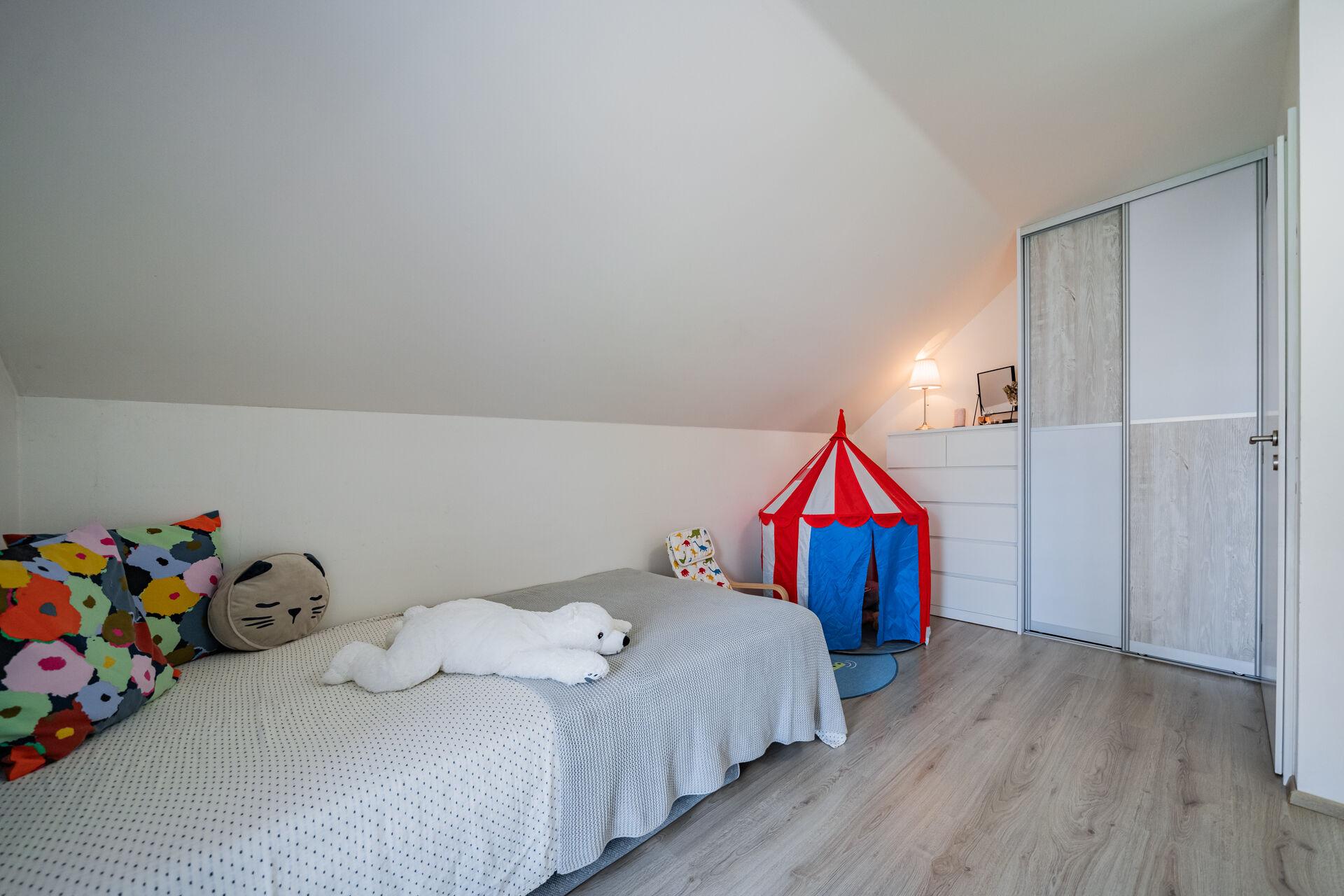 Obývací pokoj v přízemí domu s přímým vstupem na terasu a dále do zahrady, je moderně propojený s kuchyní. Ta je vybavena kuchyňskou linkou na míru se spotřebiči a je zde praktická úložná komora. V přízemí bytu je také vstupní chodba a toaleta. V patře domu jsou dva pokoje, krásná ložnice a druhý pokoj, který je v současné době rozdělen na dva, dětský pokoj a pracovnu. Koupelna je s vanou a toaletou, nechybí připojení na pračku. Topení je řešené elektrickým kotlem. Okna jsou plastová se žaluziemi. Velkou výhodou bytu je klidné bydlení, již zmiňovaná krásná, rovinatá zahrada a skvělá dostupnost Prahy či blízkých Hostivic. Parkování je pohodlné před domem.
