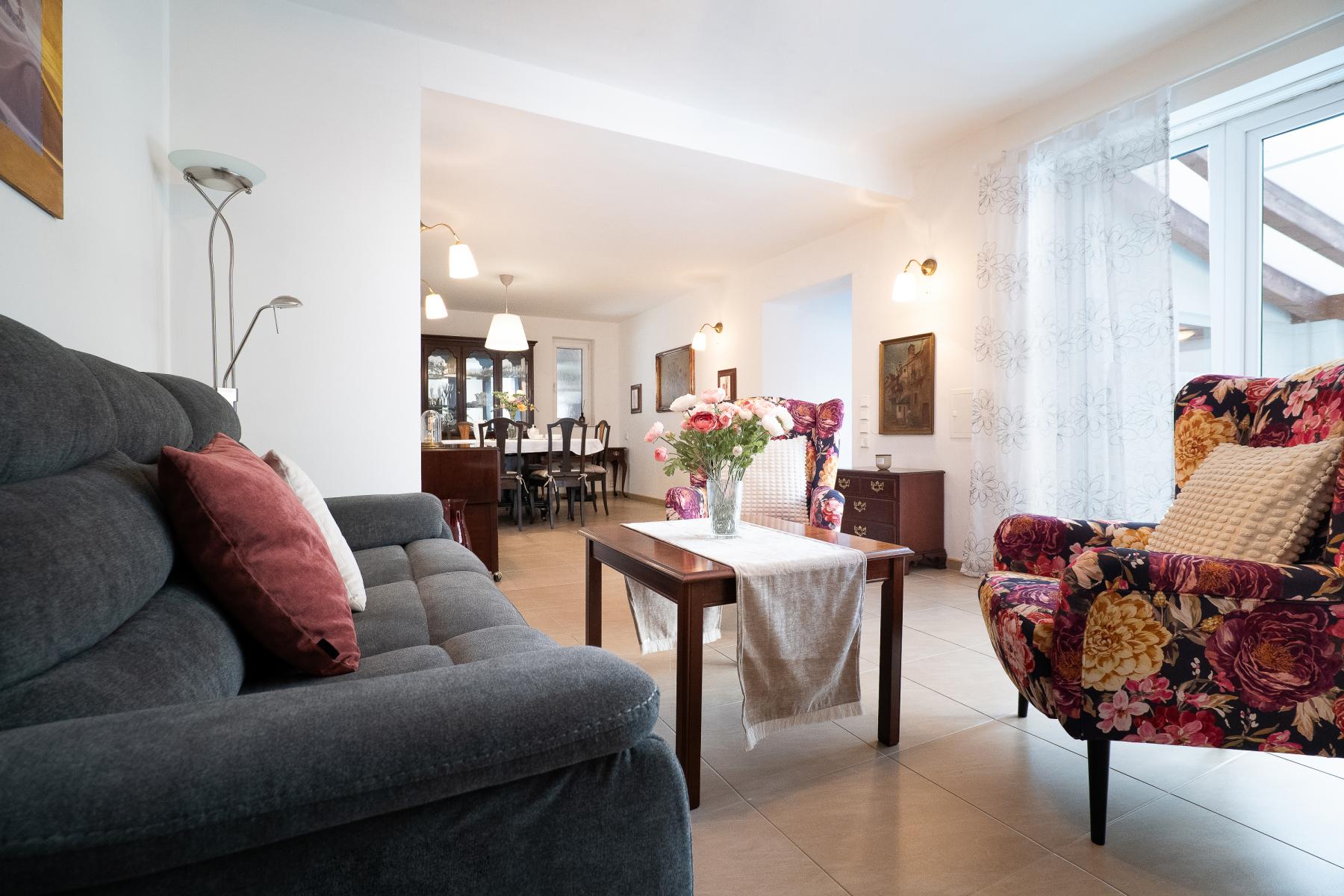 Celková plocha domu činí přibližně 273 m, přičemž první podlaží má cca 118 m a druhé podlaží cca 155 m. Dispozice domu nabízí celkem deset obytných místností, čtyři koupelny s toaletou a jednu samostatnou toaletu. V přízemí se nachází kuchyně, obývací pokoj, jídelna, dva samostatné pokoje, koupelna, samostatné WC, technické zázemí a vstupní hala. Významnou předností této části domu je krytý vyhřívaný bazén, ke kterému je přístup jak přímo z interiéru domu, tak z venkovní terasy. Prostor bazénu je vybaven podlahovým vytápěním a navazuje na samostatnou koupelnu s WC a místnost s infra saunou pro dvě osoby, což vytváří plnohodnotné domácí wellness zázemí.