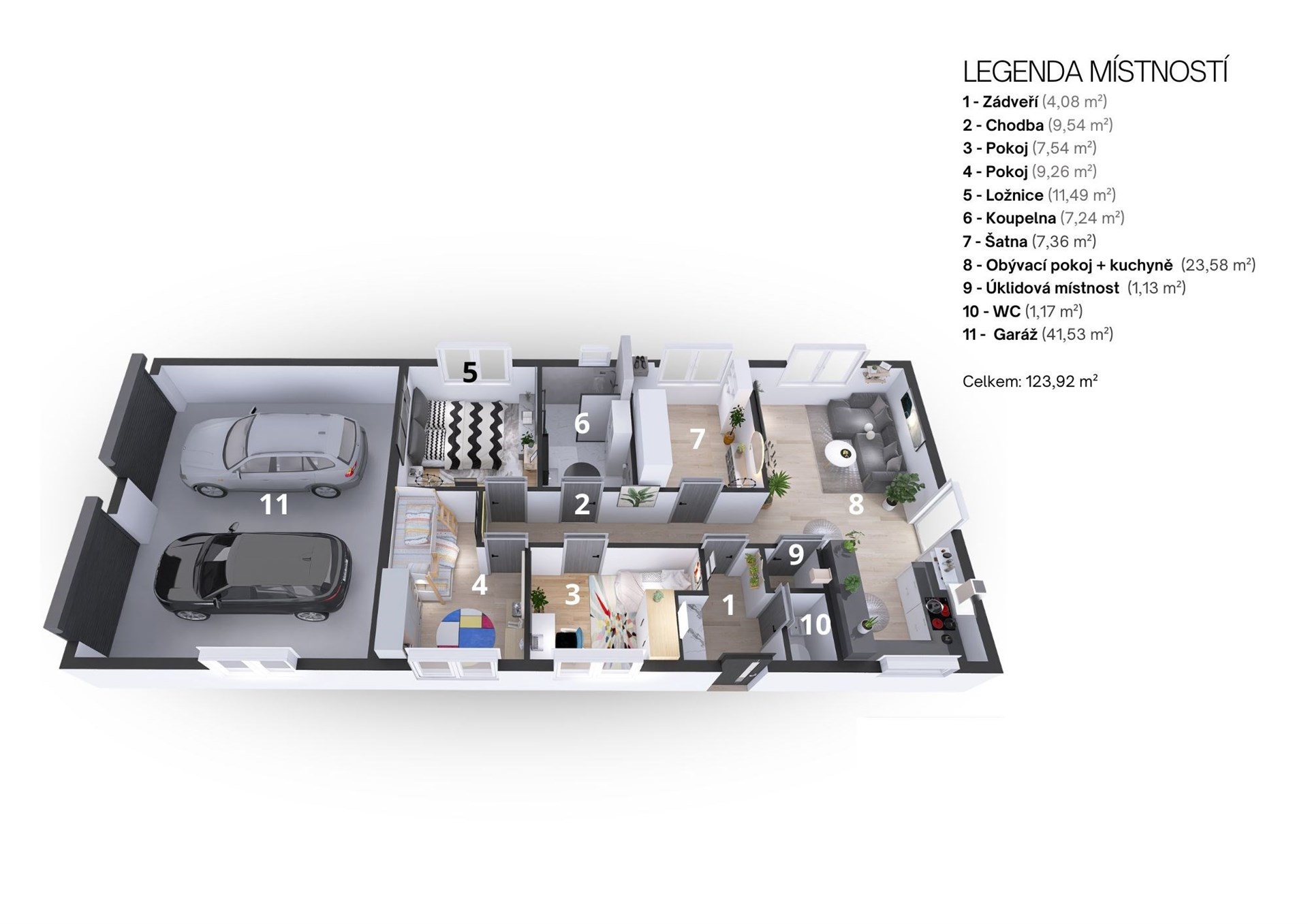 Díky bezbariérovému řešení je bydlení maximálně komfortní a dostupné pro každého – bez kompromisů . Součástí domu je prostorná garáž o rozloze 42 m² a půdní prostor k uskladnění věcí.