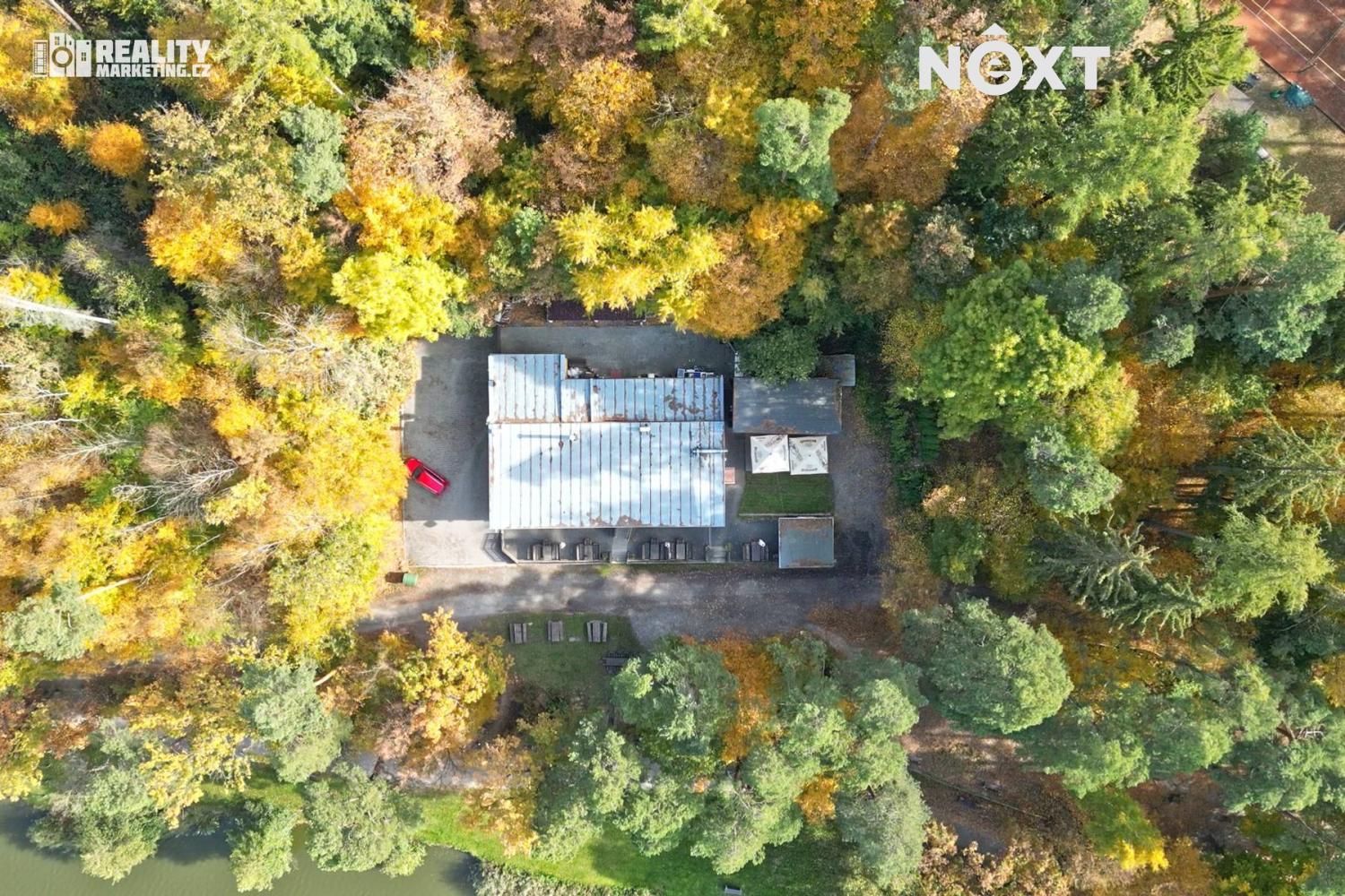 Na pozemku se nachází garáž, technická místnost, zastřešené dřevníky a venkovní altán/přístřešek — ideální pro grilování nebo posezení s výhledem na rybník.