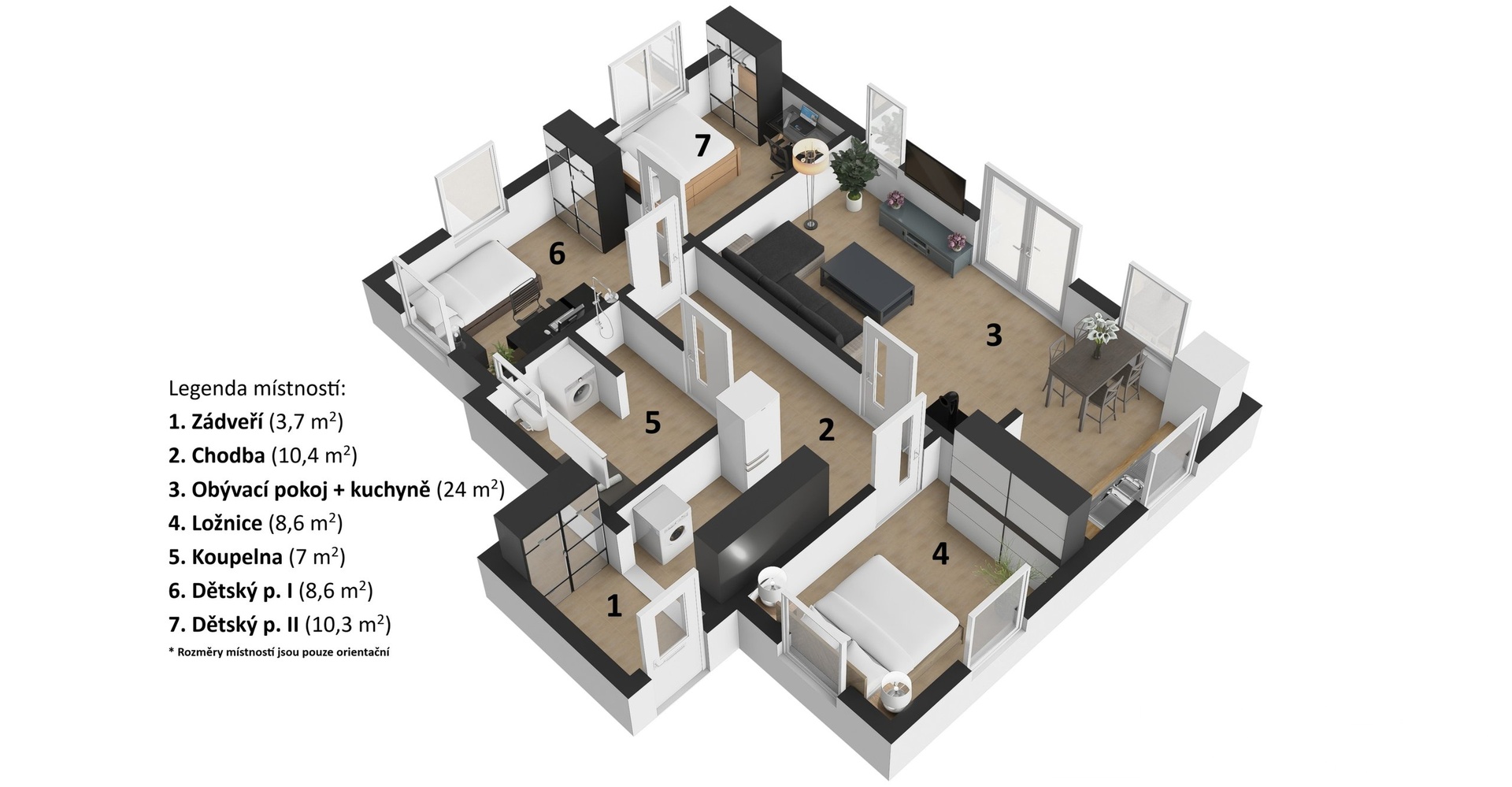 Dispozice domu 4+kk (užitná plocha cca 87 m², podlahová plocha 66 m2):