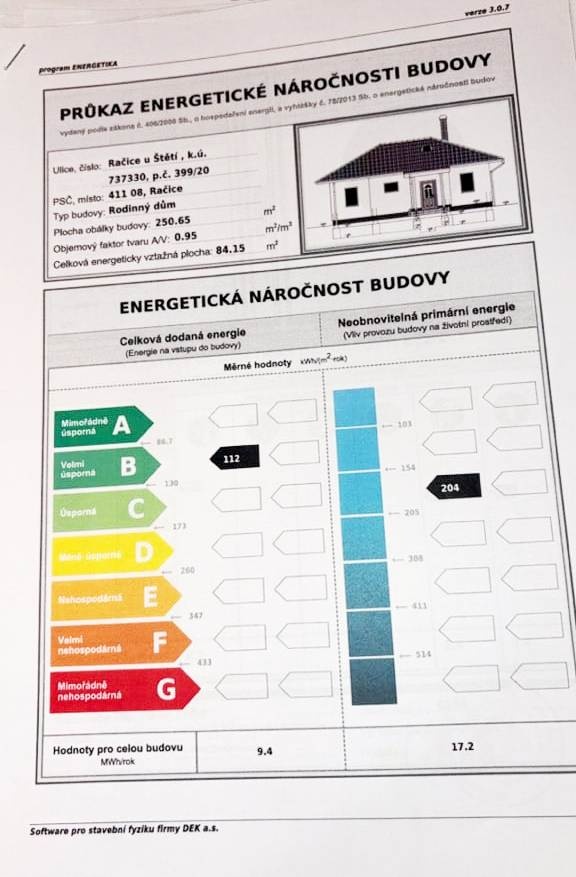 - Ukazatel energetické náročnosti budovy: 112 kWh/m²
