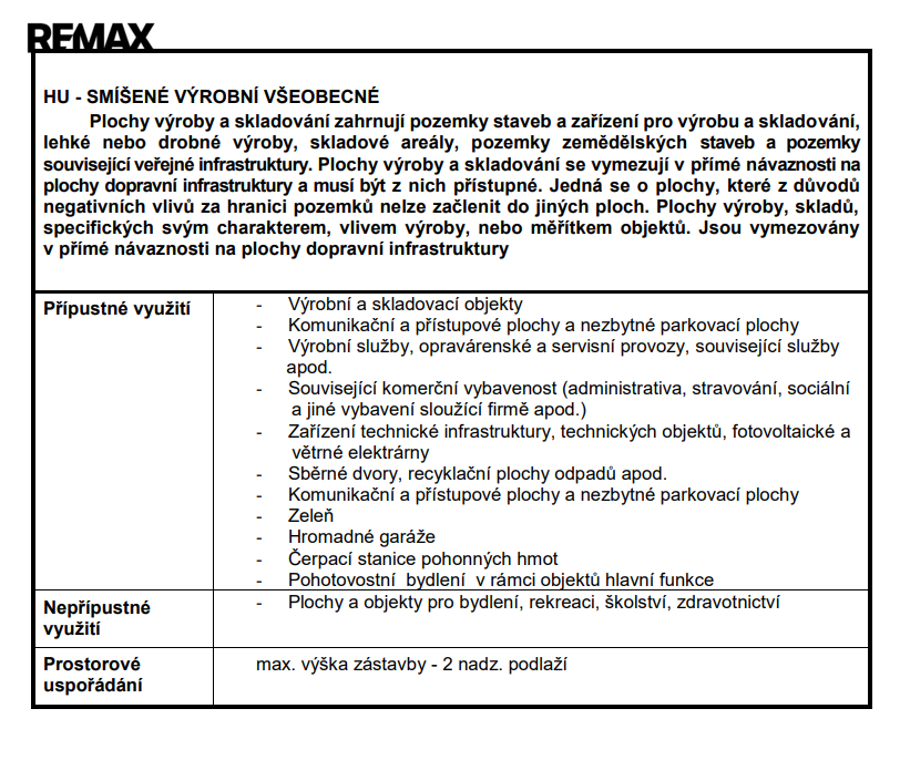Přípustné využití ploch HU - Výrobní a skladovací objekty; Komunikační a přístupové plochy a nezbytné parkovací plochy; Výrobní služby, opravárenské a servisní provozy, související služby apod.; Související komerční vybavenost (administrativa, stravování, sociální a jiné vybavení sloužící firmě apod.); Zařízení technické infrastruktury, technických objektů, fotovoltaické a větrné elektrárny; Sběrné dvory, recyklační plochy odpadů apod.; Komunikační a přístupové plochy a nezbytné parkovací plochy; Zeleň; Hromadné garáže; Čerpací stanice pohonných hmot; Pohotovostní bydlení v rámci objektů hlavní funkce.