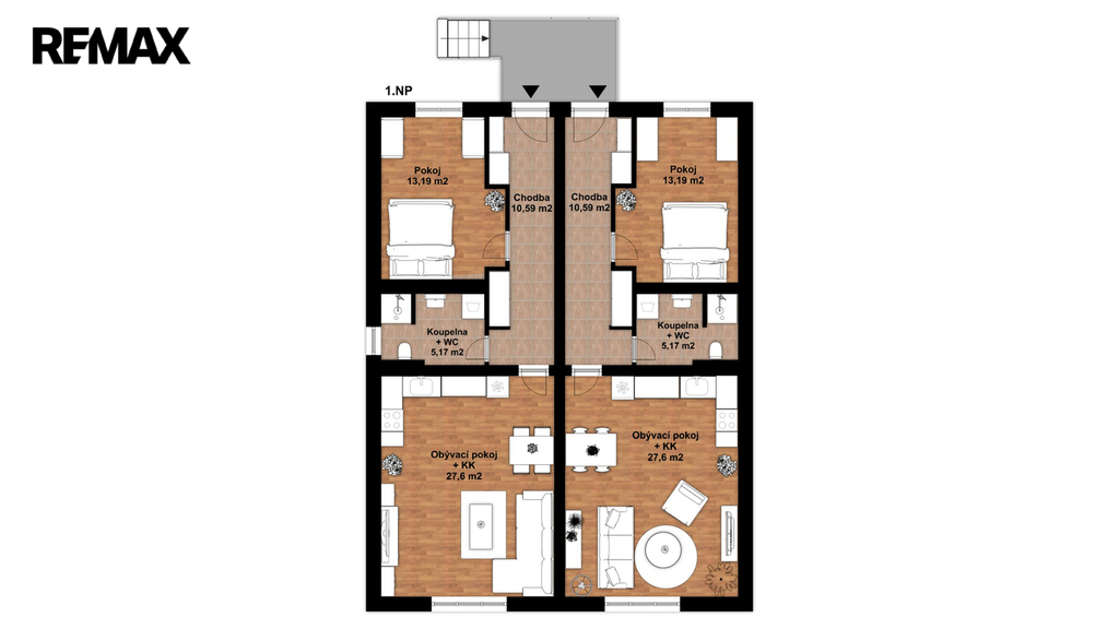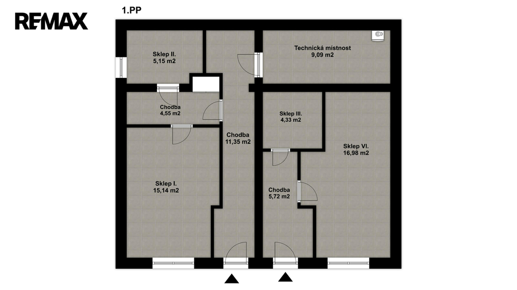V 1.PP je prostorný sklep pro každou bytovou jednotku s denním světlem, který lze využít i jako pracovnu či fitness. Součástí 1.PP je i technické zázemí pro bytové jednotky. Ke každému bytu patří zahrada a o celkové výměře 478 m2. Zahrada je ve společném vlastnictví dvojdomu a bude rozdělena ideální polovinou.