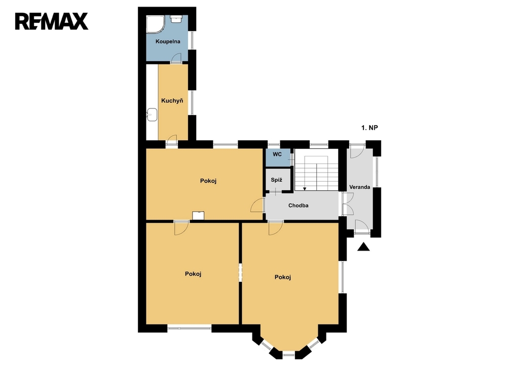 V 1.NP nalezneme vstupní chodbu, obývací pokoj, kuchyň, ložnici, samostatnou toaletu, spíž, prostornou koupelnu se sprchovým koutem a umyvadlem.