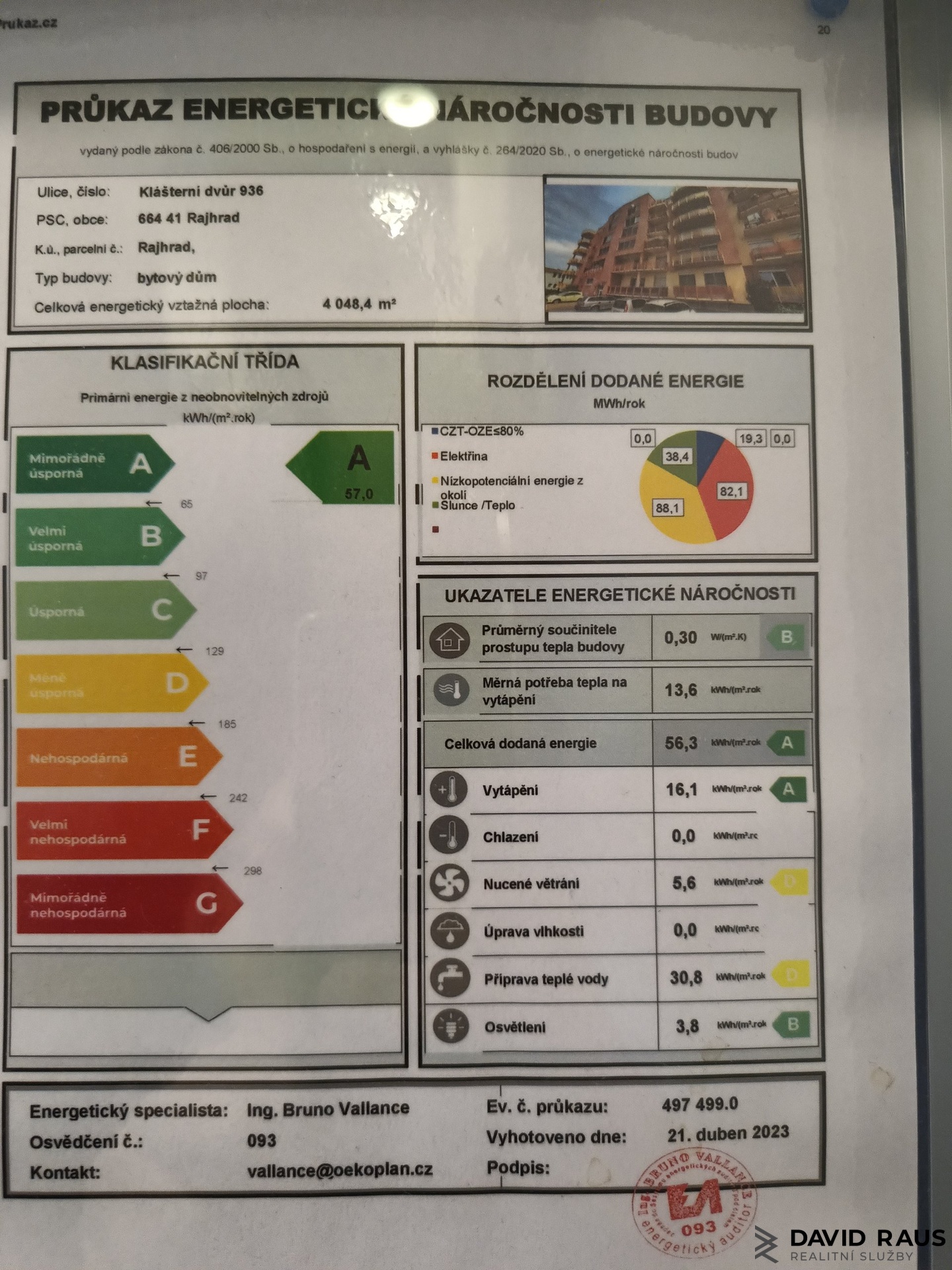- Ukazatel energetické náročnosti budovy: 41.9 kWh/m²