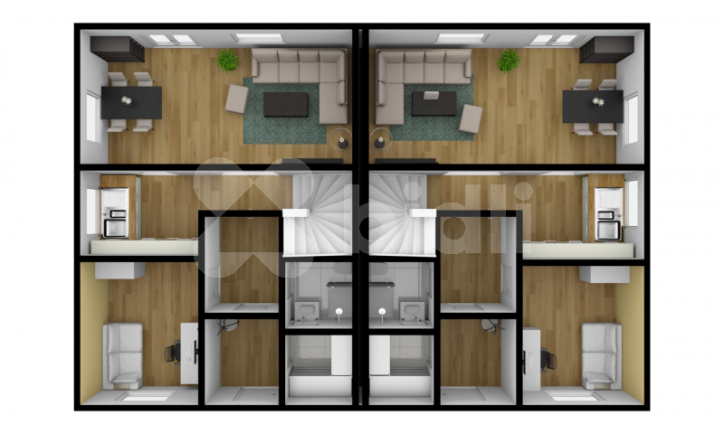 Celková cena obsahuje cenu pozemku, projekt na typový dvojdům, základovou desku, připojení na IS a výstavbu dvojdomku na klíč. Můžete si vybrat z celé řady typových domů, ale i měnit vnitřní dispozice a zvolit si i z čeho bude Váš dům postaven. Cena se potom bude upravovat dle Vašich požadavků.
