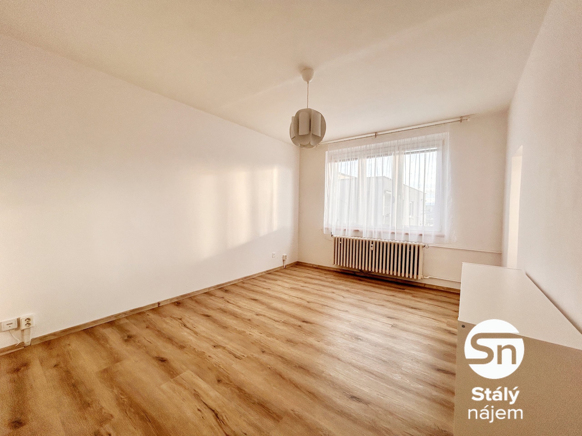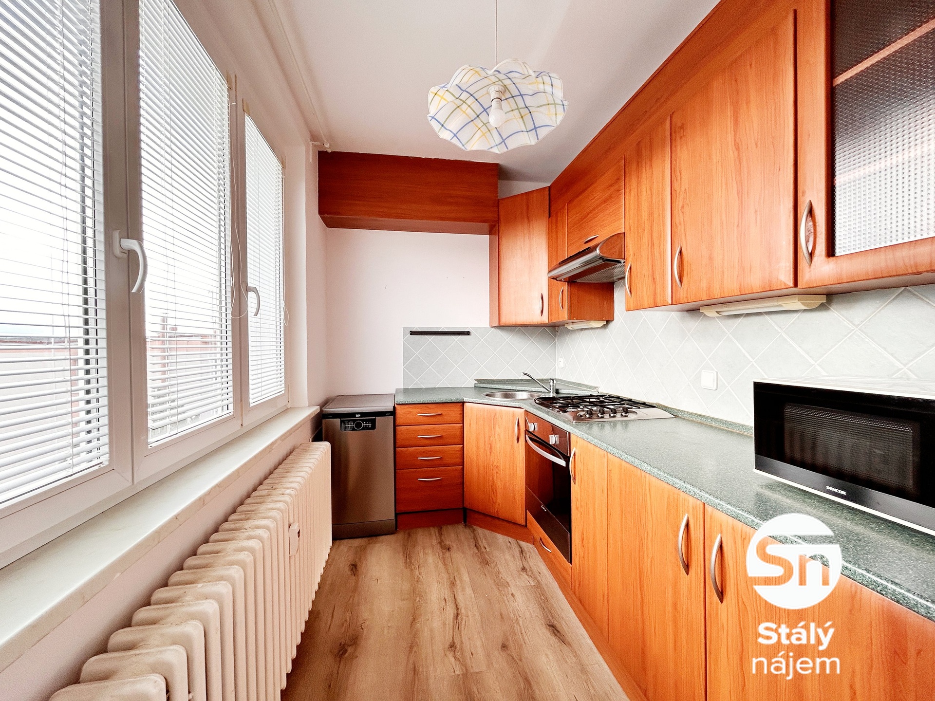 Součástí je funkční kuchyňská linka se spotřebiči a po domluvě je možné ponechat i volně stojící skříň. Ostatní nábytek lze jednoduše odstranit dle přání nového podnájemce. Dispozice zahrnuje samostatnou kuchyň, dva neprůchozí pokoje, koupelnu s rohovou vanou a samostatné WC. Velká okna zajišťují dostatek denního světla a z bytu je příjemný výhled na okolní zástavbu a zeleň.