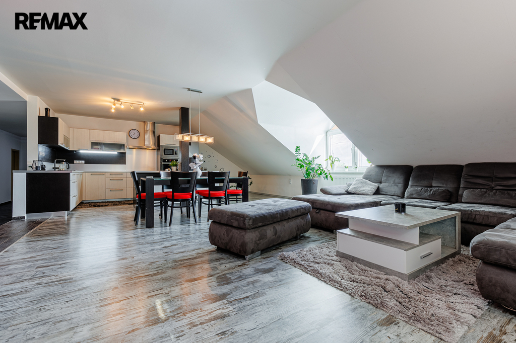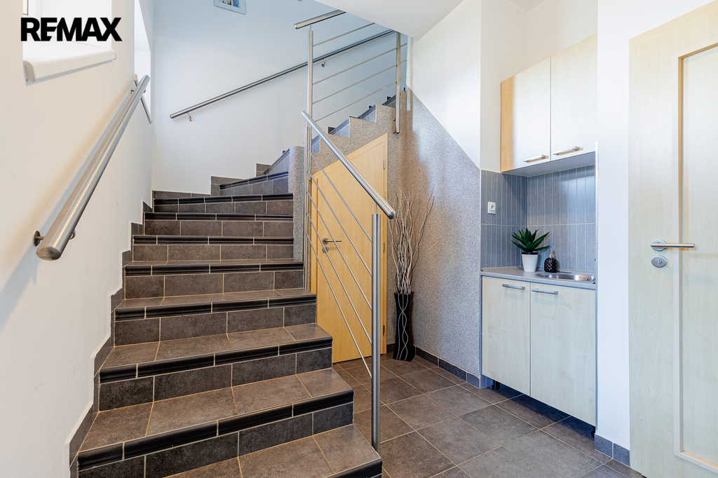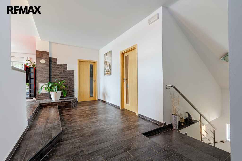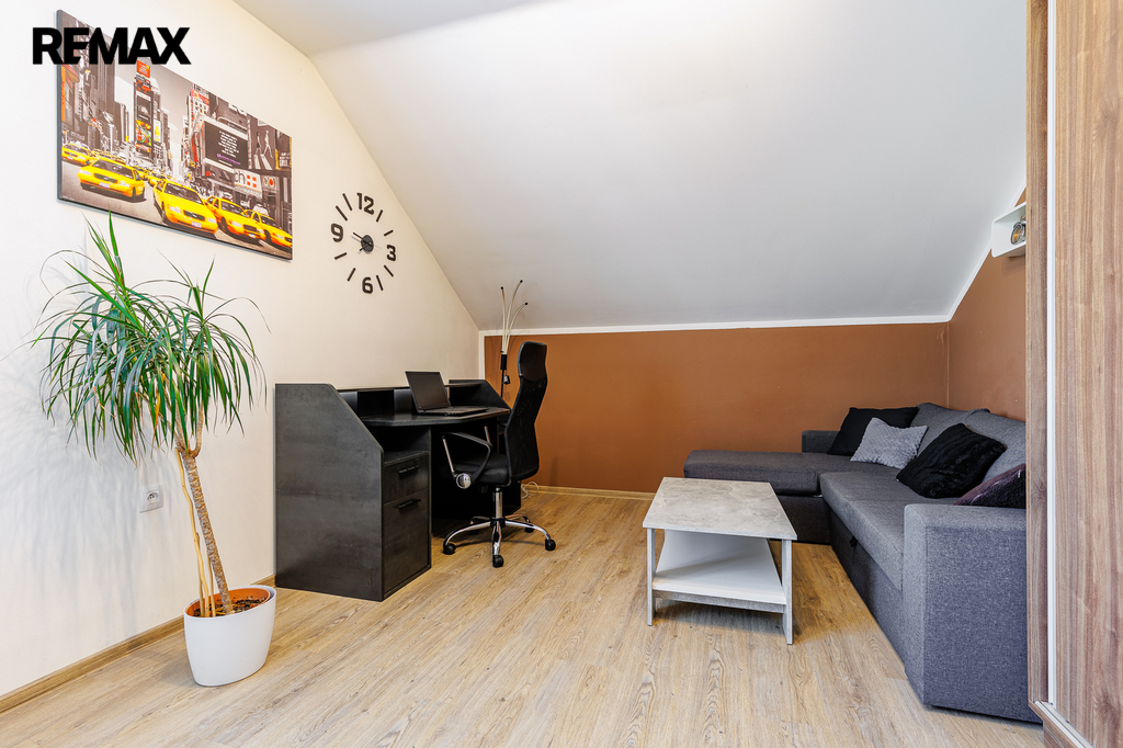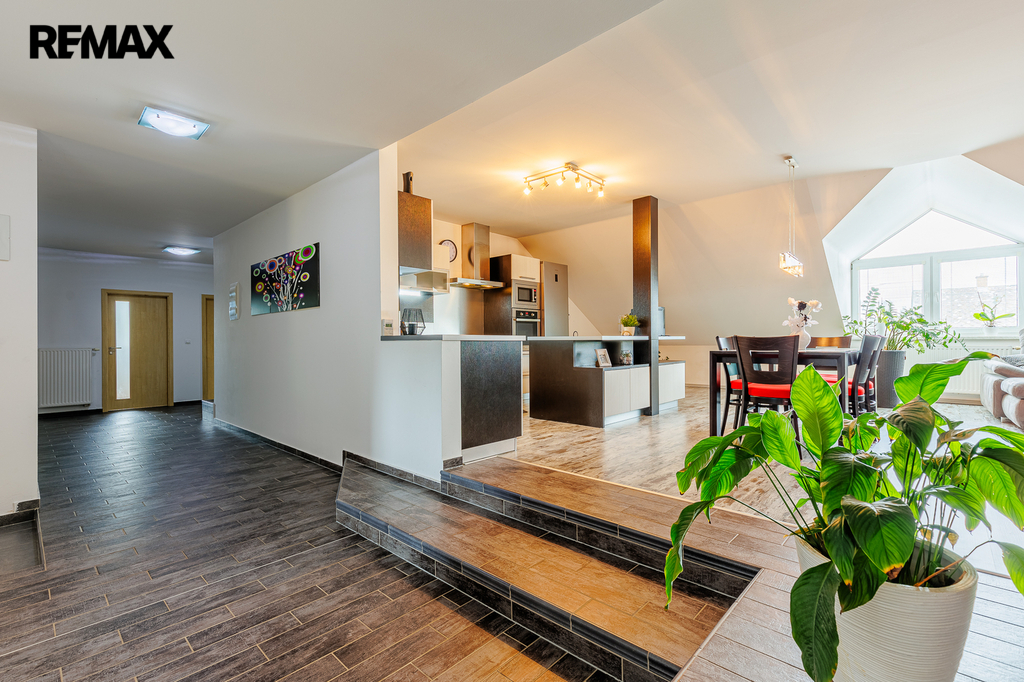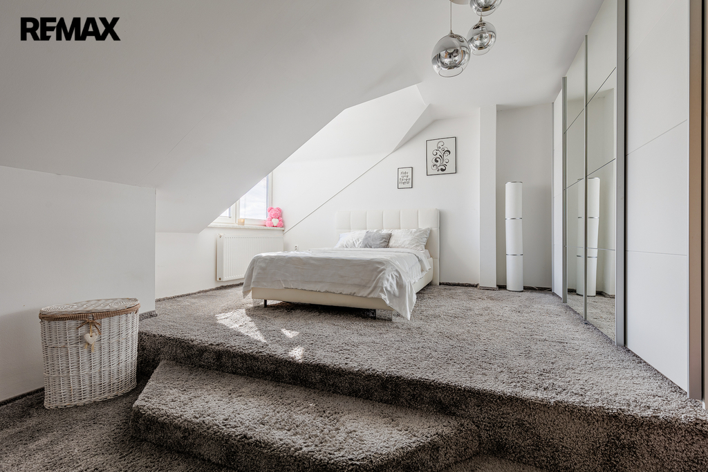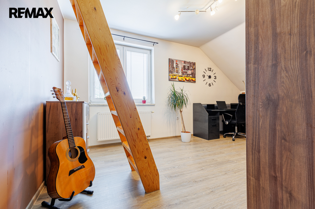 V patře, které bylo dostavěno v roce 2010, se nachází prostorný byt o dispozici 6+kk a celkové užitné ploše 174 m². Dominantou bytu je velký obývací pokoj s kuchyňským koutem, který působí vzdušně a nabízí spoustu prostoru pro rodinu i přátele. Dále jsou zde čtyři samostatné ložnice, pracovna, koupelna s vanou i sprchovým koutem, oddělené WC a komora. Byt je nadstandardně vybaven, světlý a pečlivě navržený do posledního detailu, aby poskytoval maximální komfort pro rodinné bydlení i případné pronájmy.