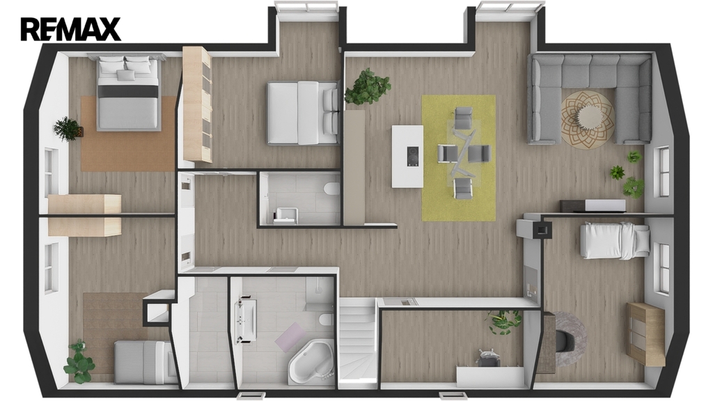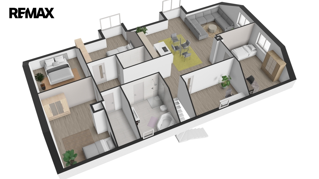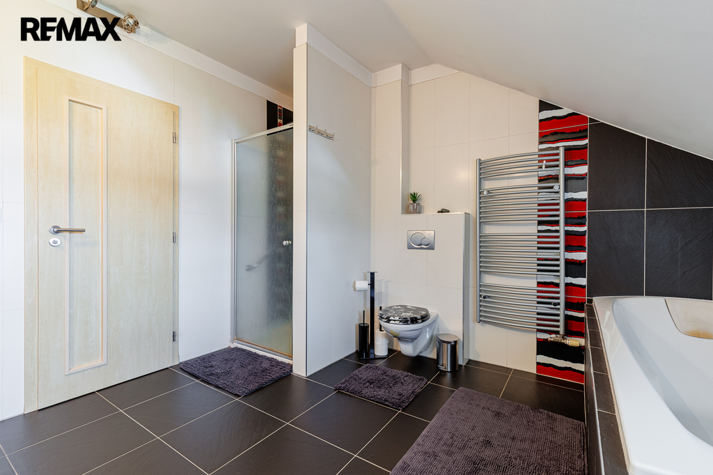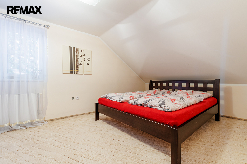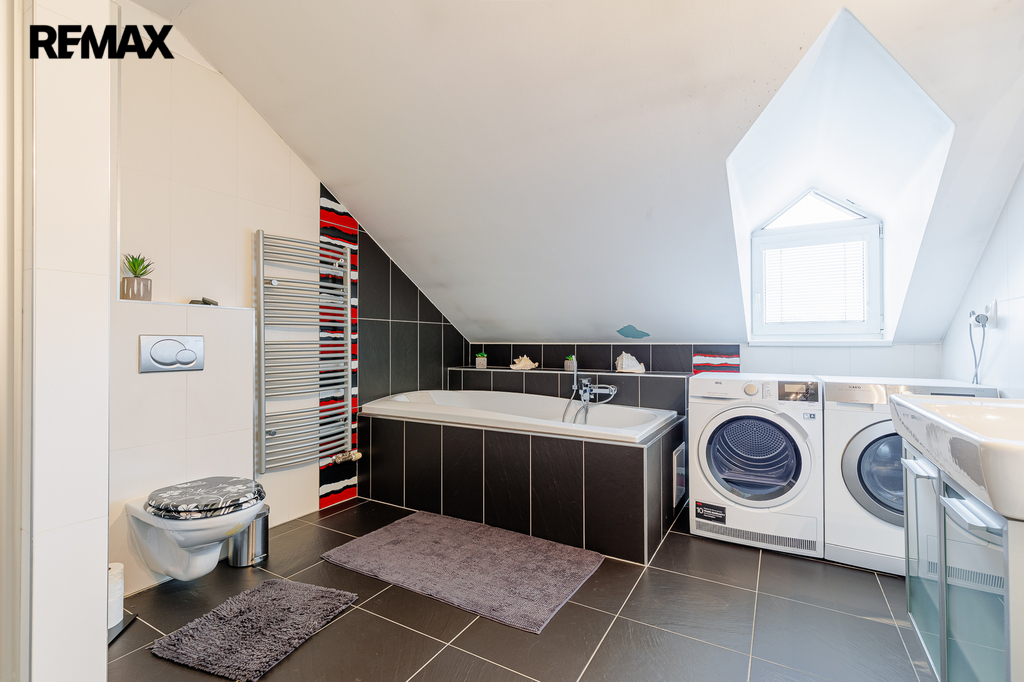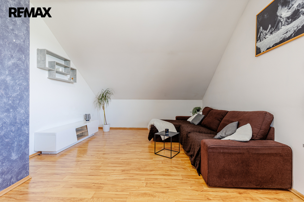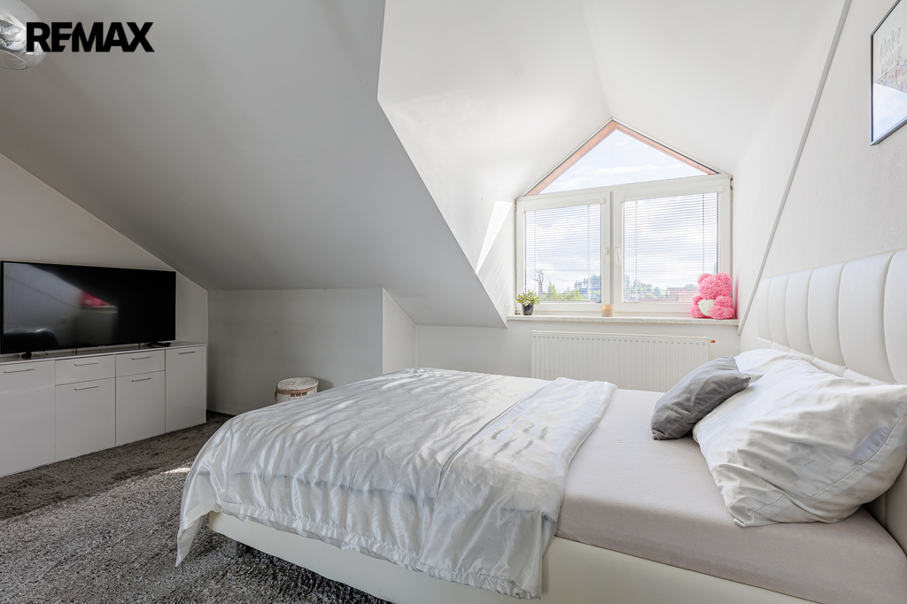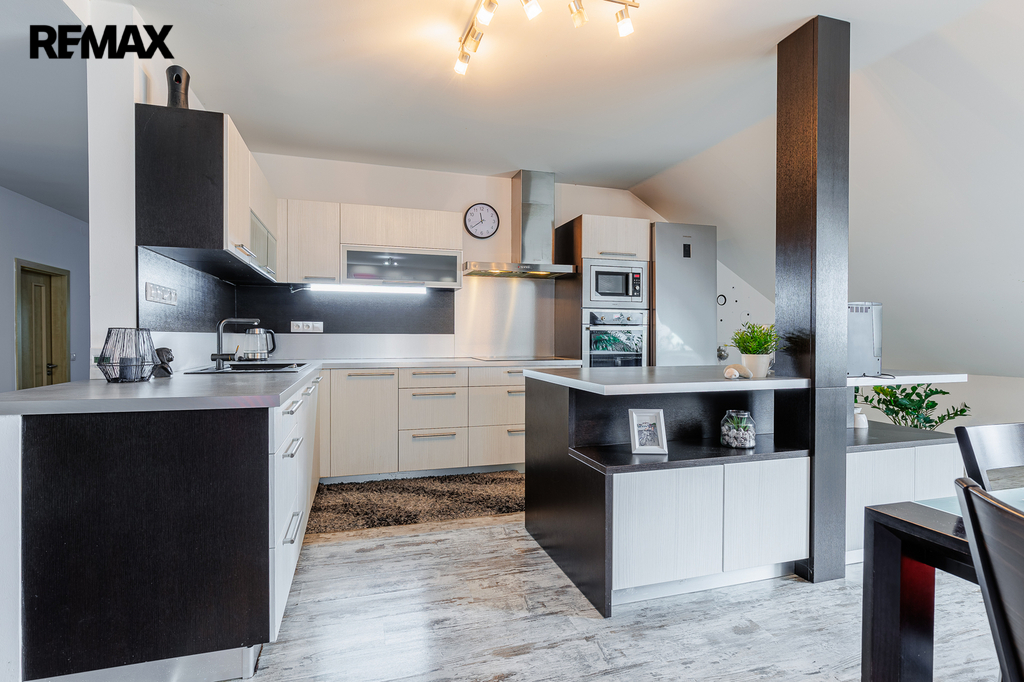 V patře, které bylo dostavěno v roce 2010, se nachází prostorný byt o dispozici 6+kk a celkové užitné ploše 174 m². Dominantou bytu je velký obývací pokoj s kuchyňským koutem, který působí vzdušně a nabízí spoustu prostoru pro rodinu i přátele. Dále jsou zde čtyři samostatné ložnice, pracovna, koupelna s vanou i sprchovým koutem, oddělené WC a komora. Byt je nadstandardně vybaven, světlý a pečlivě navržený do posledního detailu, aby poskytoval maximální komfort pro rodinné bydlení i případné pronájmy.