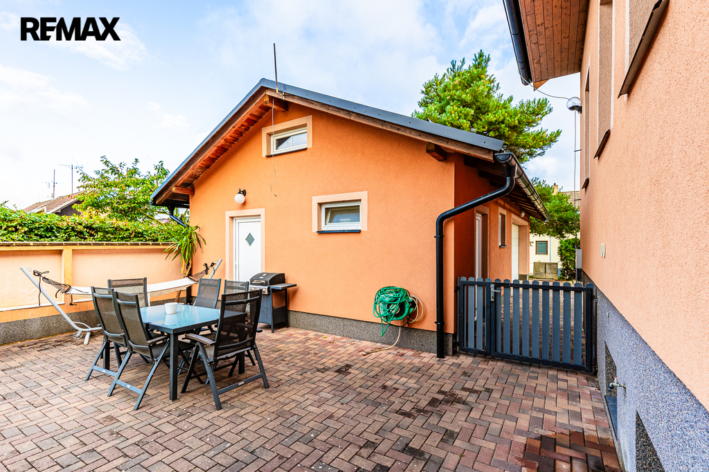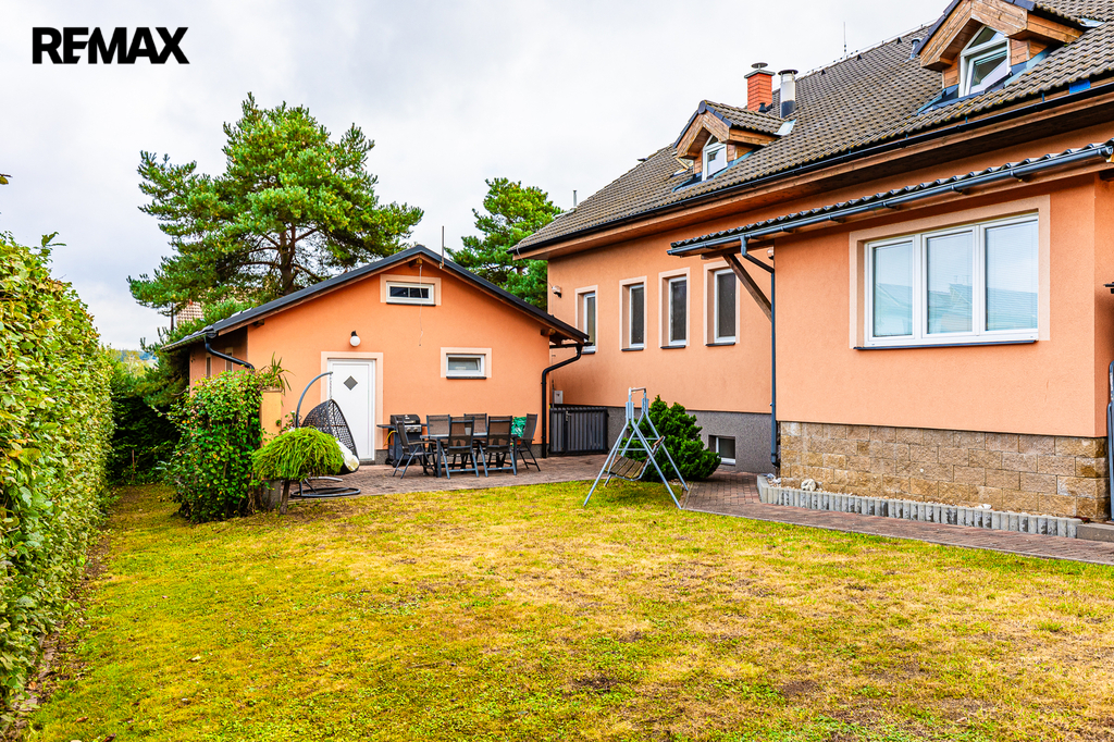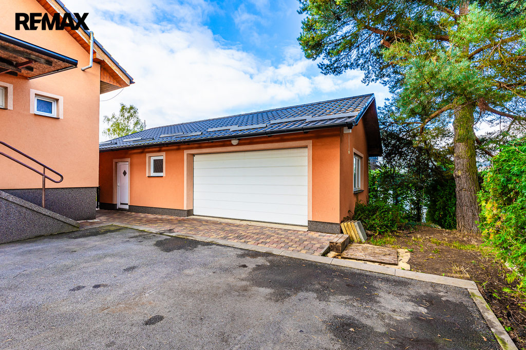 Pozemek kolem domu působí upraveně a klidně. Najdete zde garáž o velikosti 71 m², dostatek parkovacích ploch a prostor se vzrostlými stromy, který přirozeně propojuje dům s přírodou. Zahradní část doplňuje praktické venkovní zázemí – toaleta a umyvadlo, ideální pro letní posezení nebo menší akce.