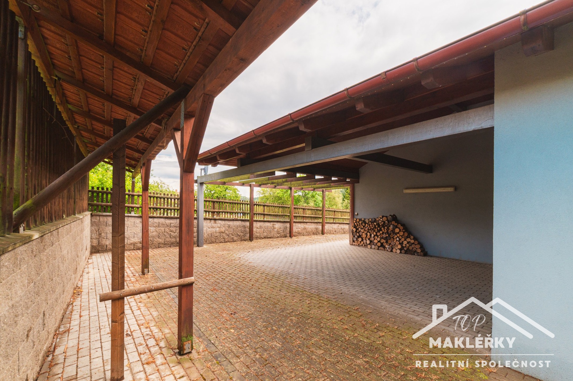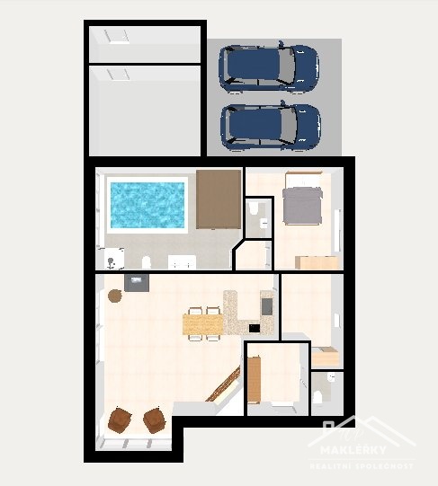 Dominantním prostorem nemovitosti je velkorysý obývací pokoj s kuchyňským koutem, který se i díky krbu stává přirozeným centrem společného života. K opravdovému odpočinku přispívá také wellness zóna se saunou z cedrového dřeva, bazénem s protiproudem a sprchou. Bytovou část dále tvoří ložnice a rovněž komora, kterou lze přizpůsobit a proměnit v dětský pokoj. Dílna a druhá komora jsou přístupné samostatně, a to prostřednictvím vrat s elektrickým pohonem nebo dveřmi v zadní části domu. Až pro dvě auta je k dispozici kryté parkovací stání.