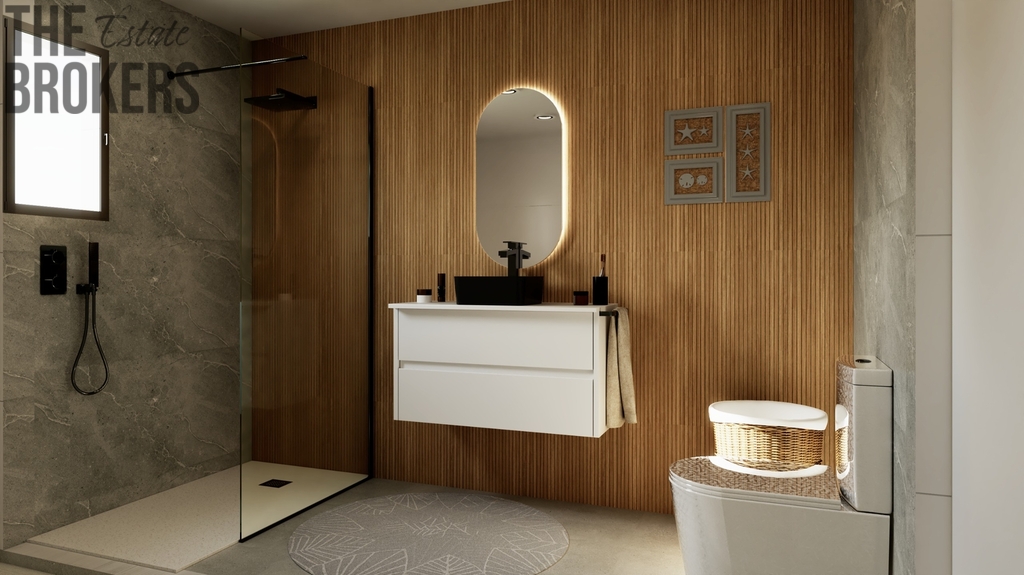 - Vily se pyšní elegantními, moderními prvky, jako jsou velkoformátové kamenné dlažby, bíle lakované interiérové dveře a vestavěné skříně.