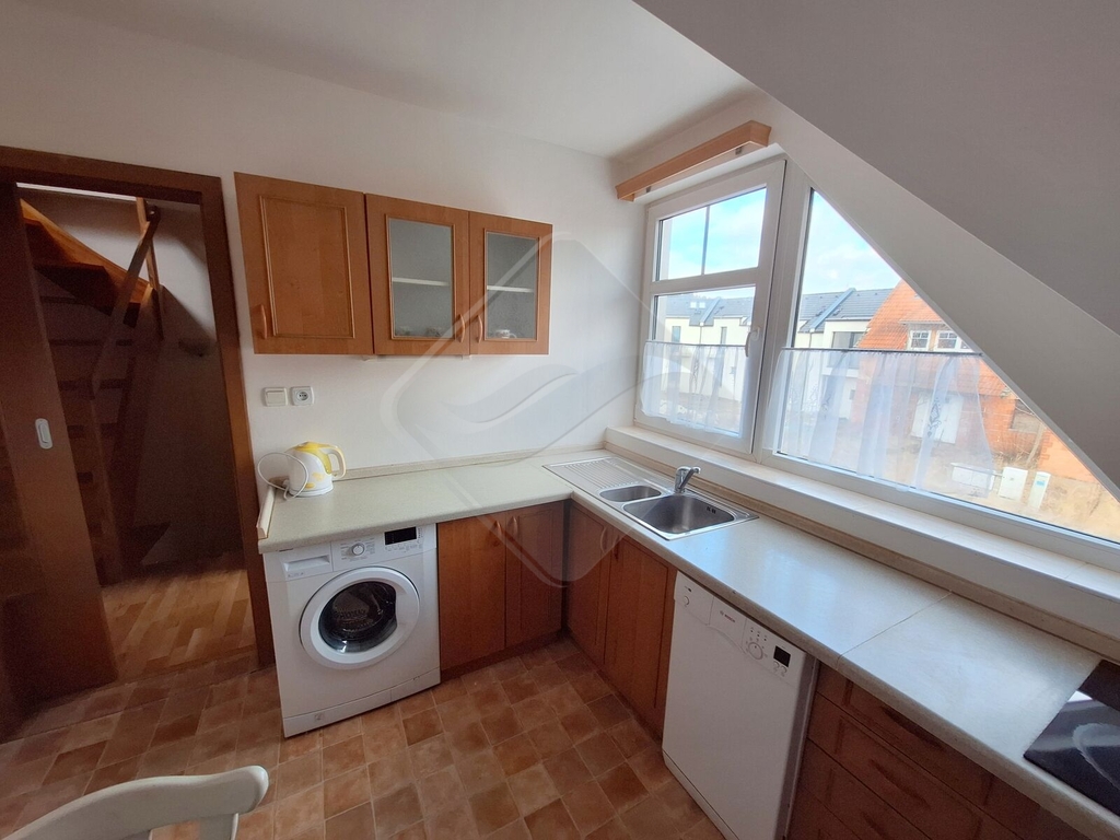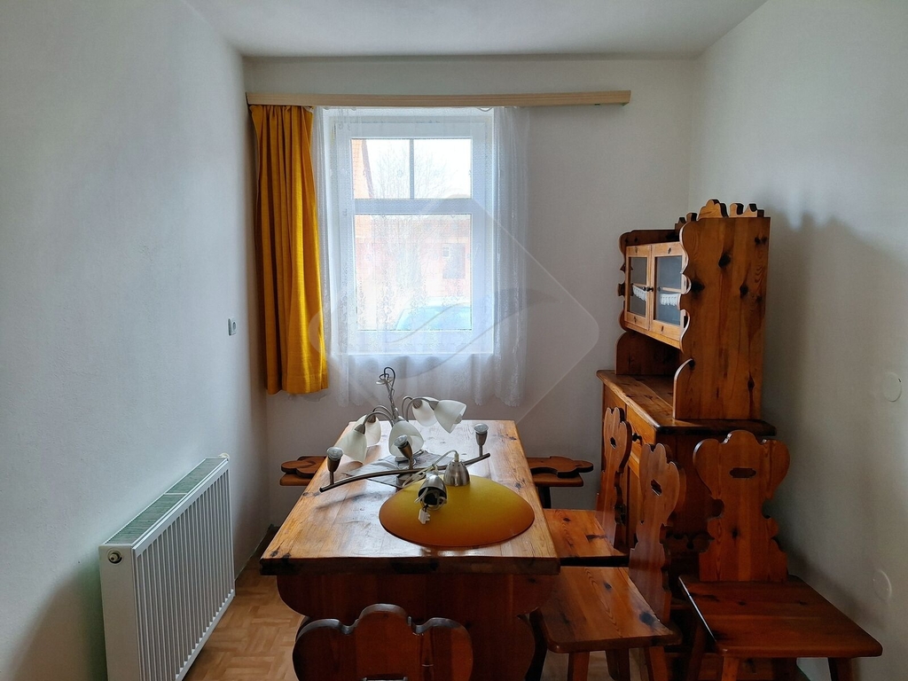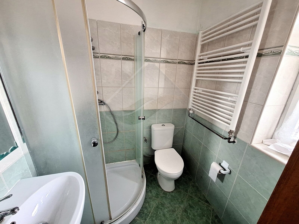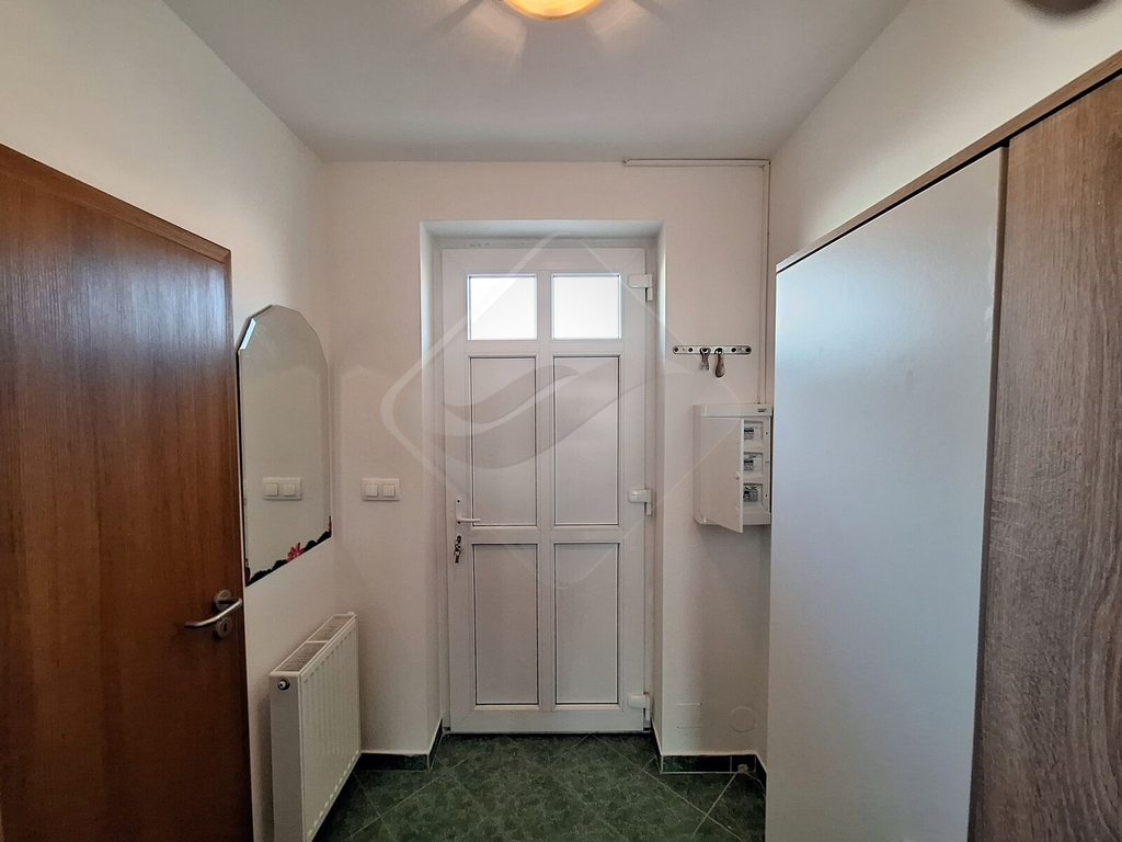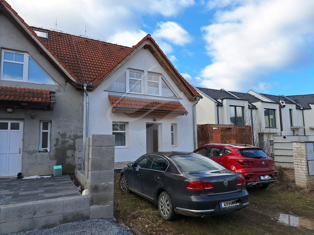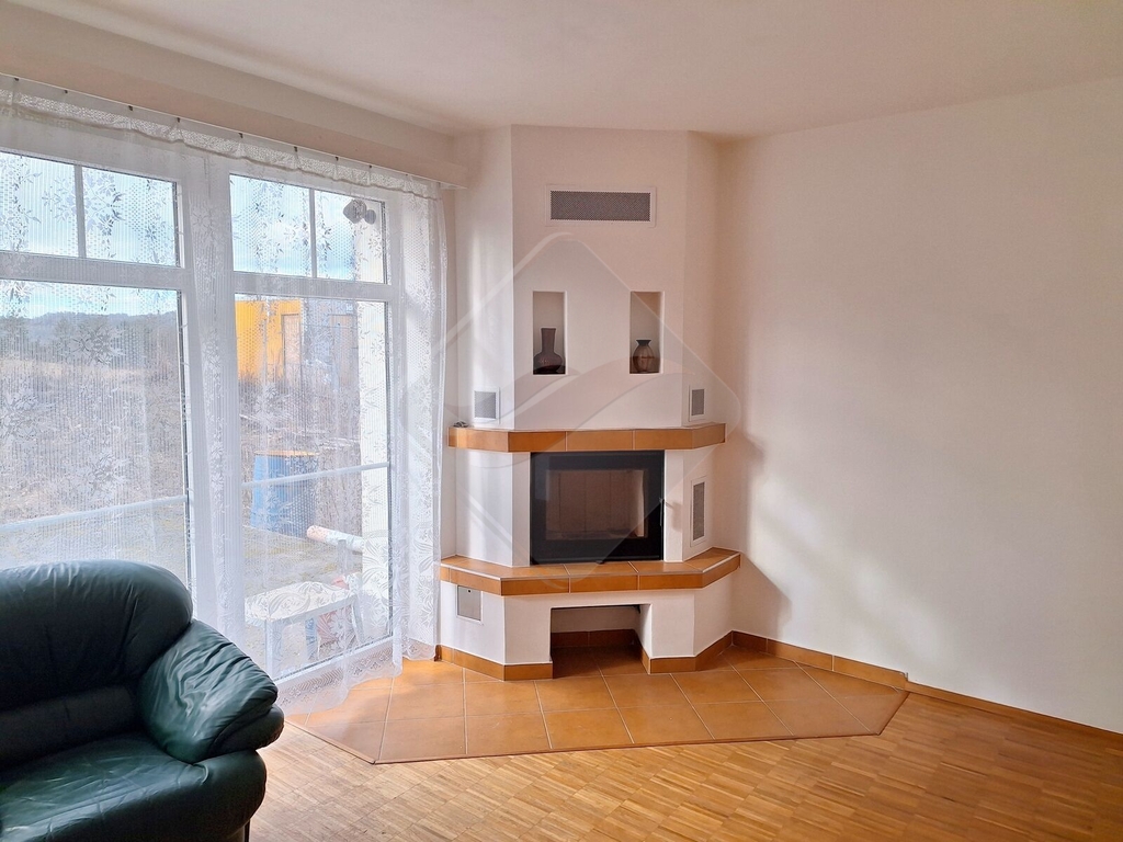 V přízemí naleznete prostorný obývací pokoj s krbem a kuchyňskou linkou (oproti fotografiím je kuchyňská linka instalována v obývacím pokoji) s výstupem na zahradu, pokoj, technickou místnost s elektrickým kotlem a bojlerem, koupelnu s WC a zádveří.