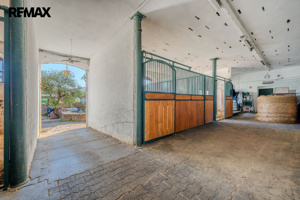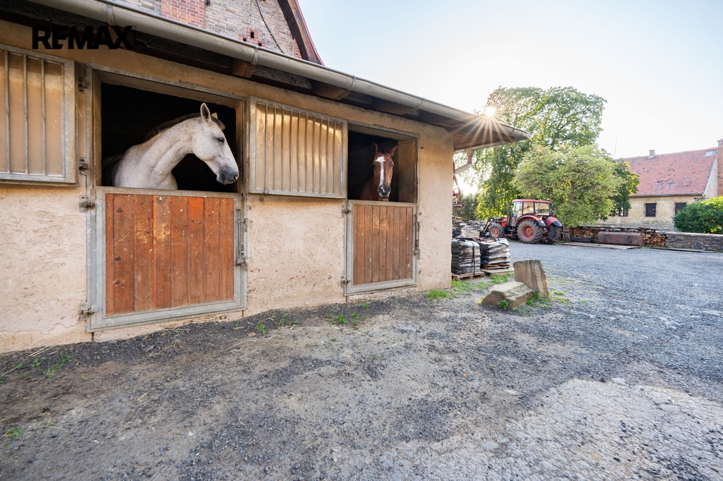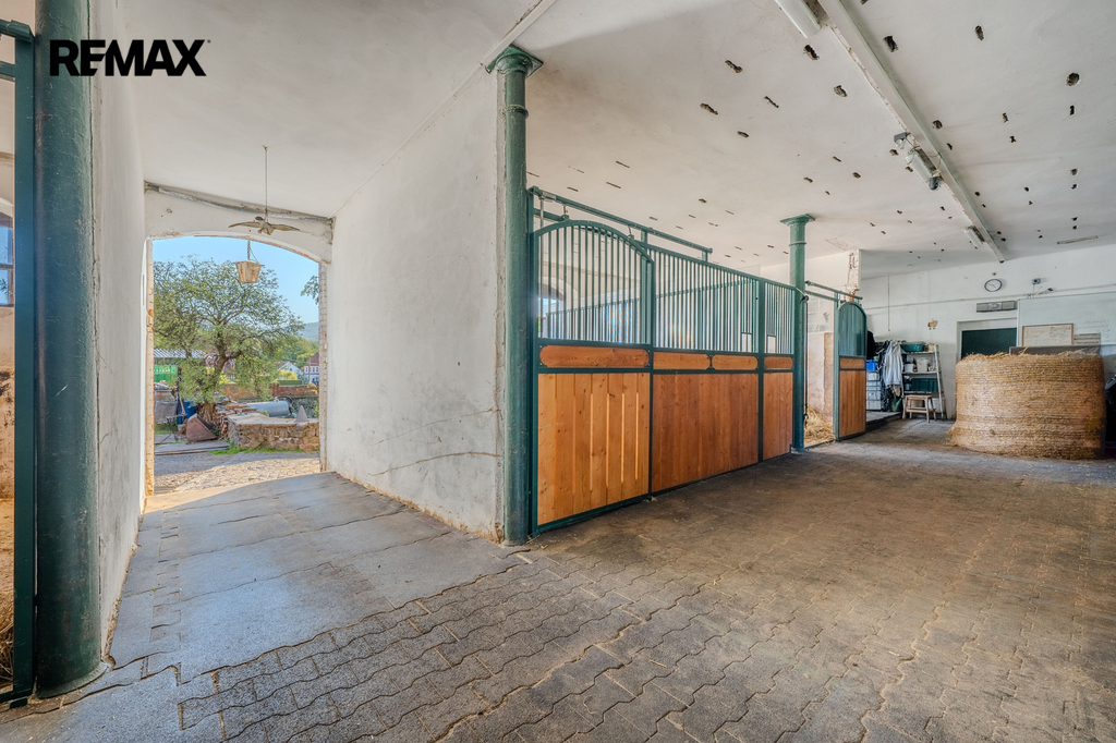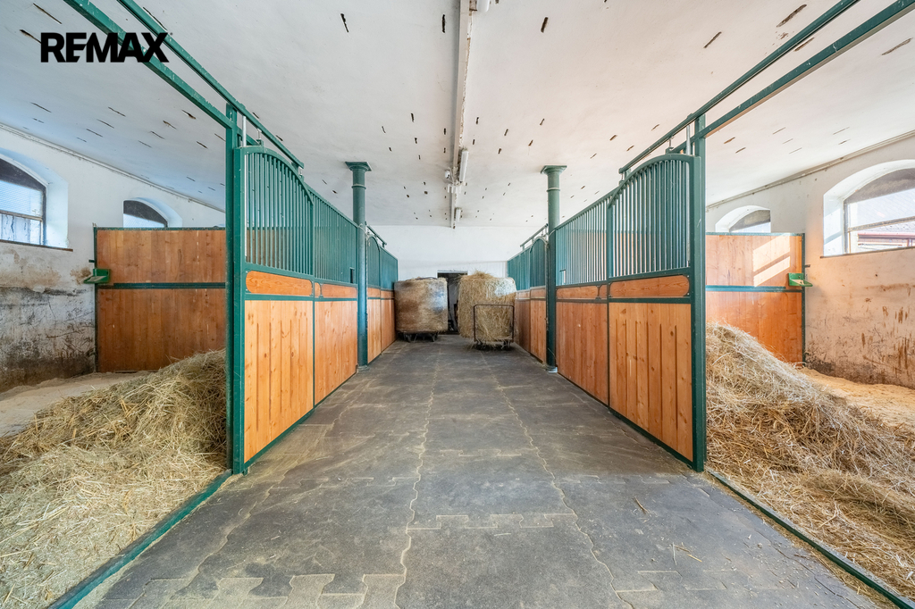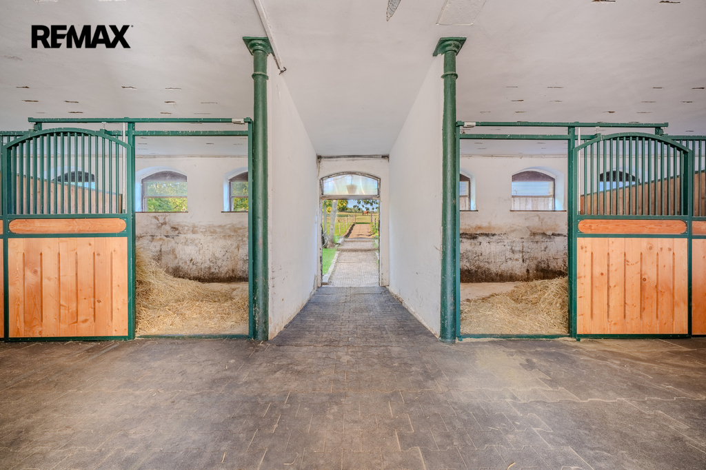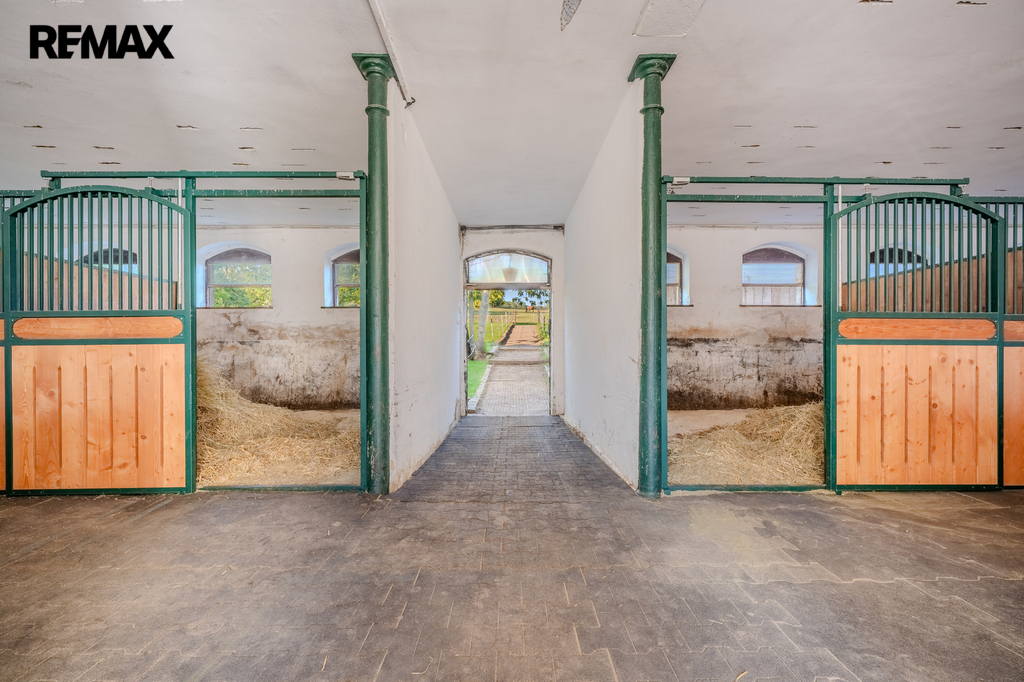Další budova slouží jako prostorné stáje s kapacitou pro více než čtyřicet koní. Zázemí je plně funkční a uzpůsobené pro každodenní provoz s důrazem na pohodlí zvířat i efektivitu práce. U vstupu do areálu se nachází třetí objekt určený k rekonstrukci, který nabízí možnost vybudovat apartmány pro hosty či ubytování pro personál.