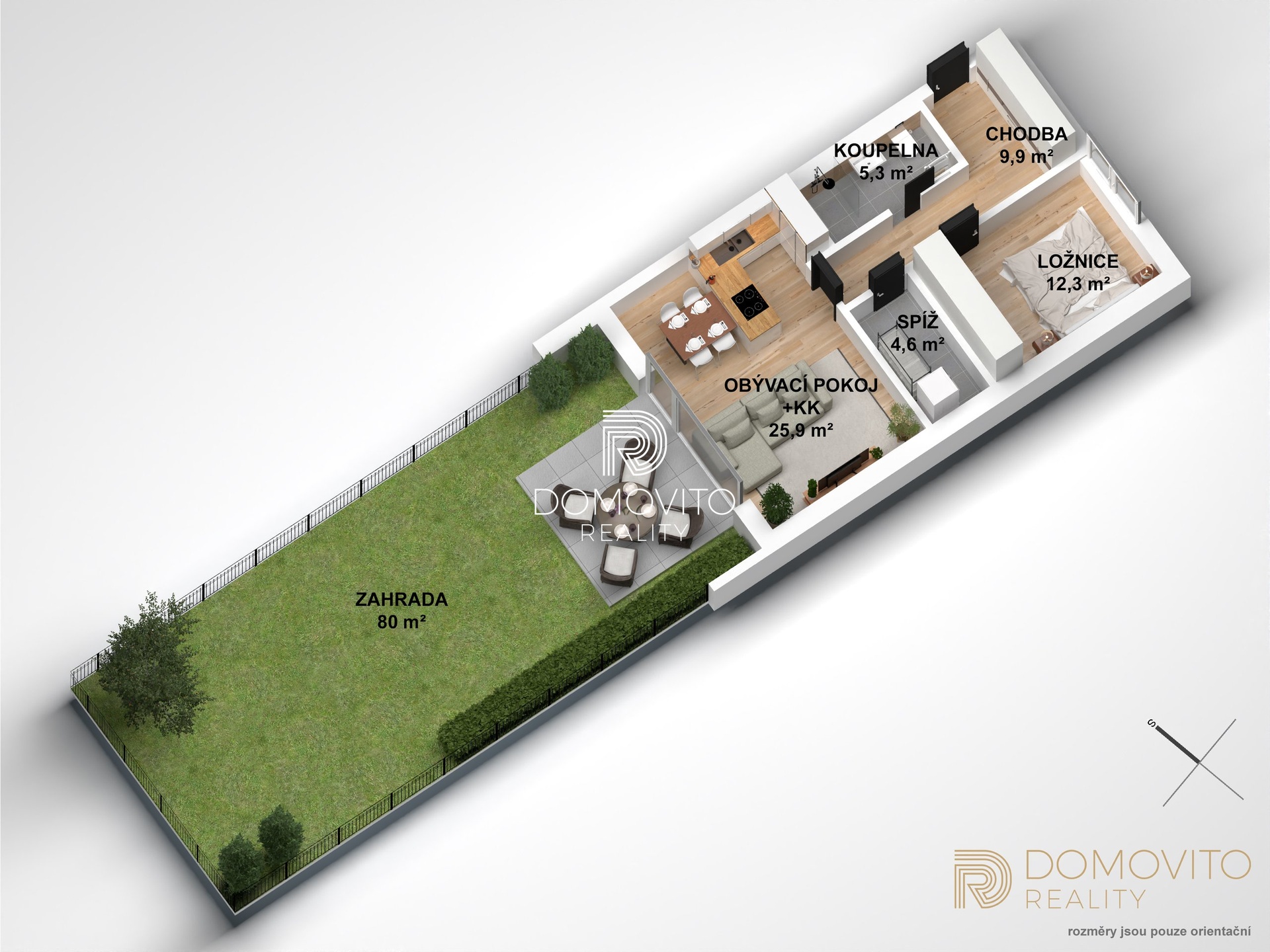 1. Byt 2+kk (58 m²) – s přímým vstupem na zahradu 80 m² a vlastním parkovacím místem.