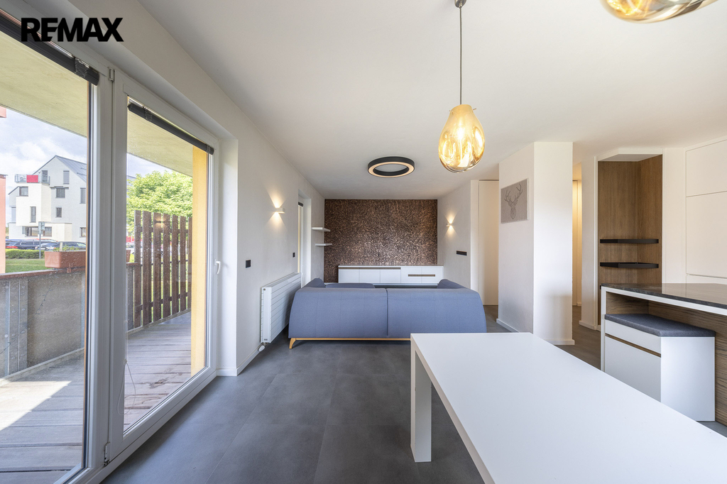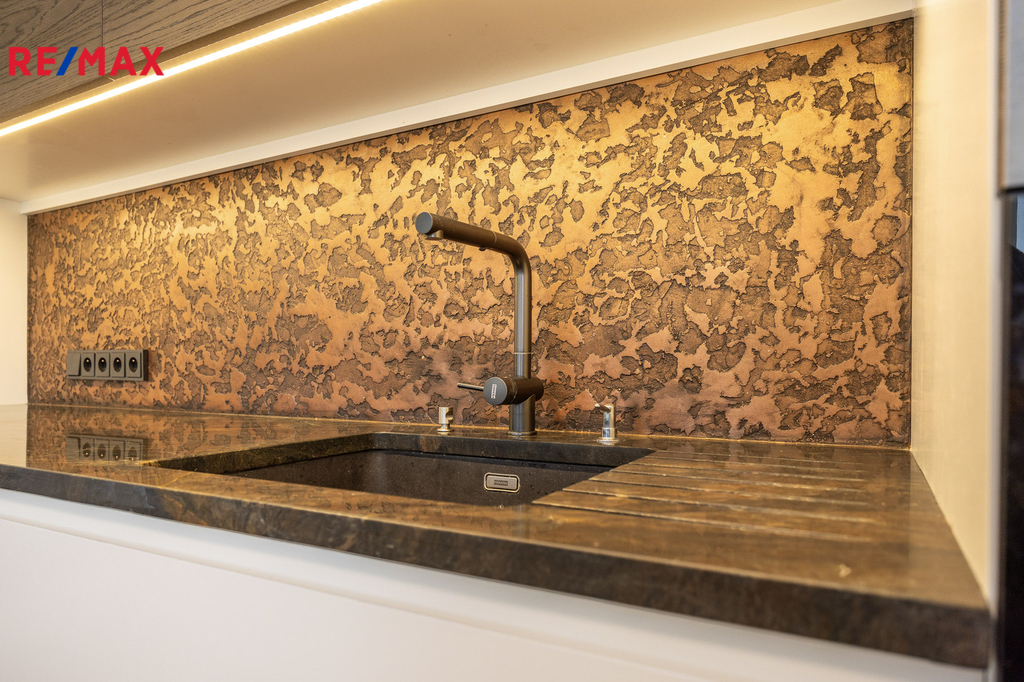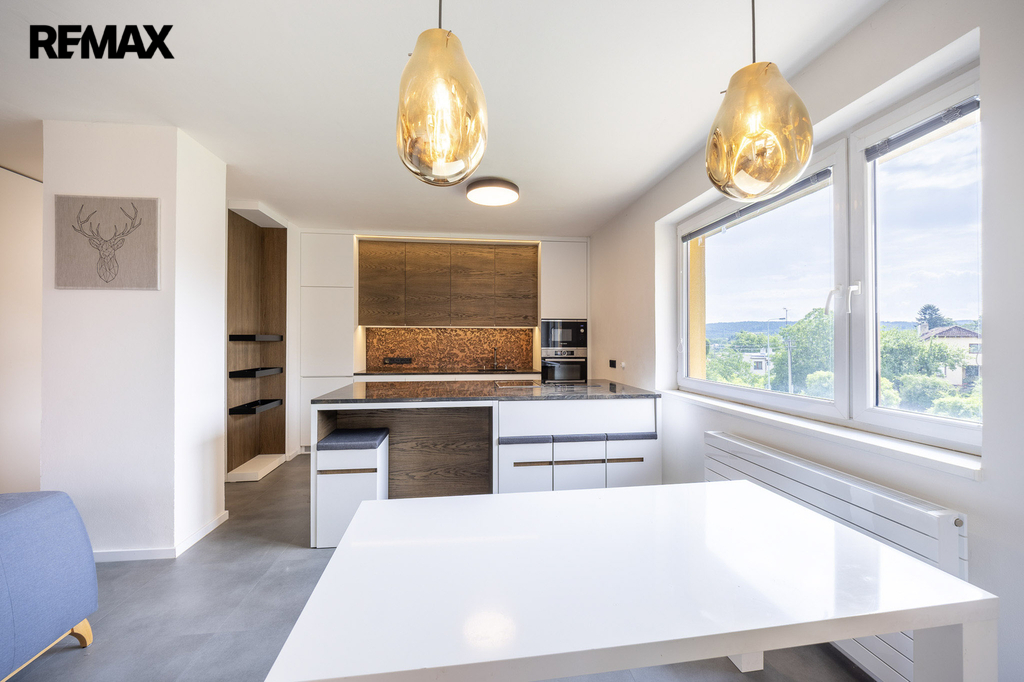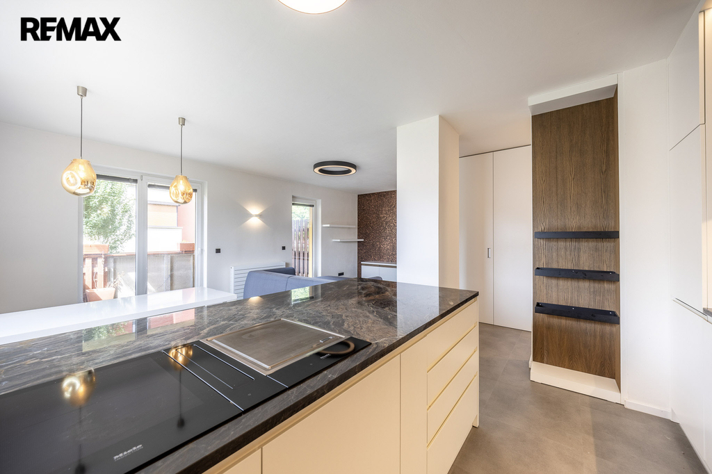 Dominantou bytu je světlý obývací pokoj s kuchyňským koutem, kde vás zaujme designová stěrka od společnosti Němec a kuchyňská linka na míru z dílny truhláře, osazená kamennou pracovní deskou. Kuchyňský ostrůvek je chytře řešený – zabudované židle lze pohodlně vysunout a zasunout, čímž šetří prostor a zvyšují praktičnost.