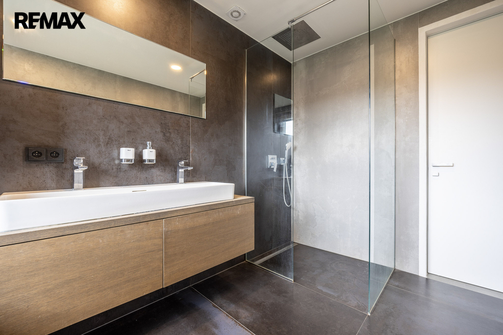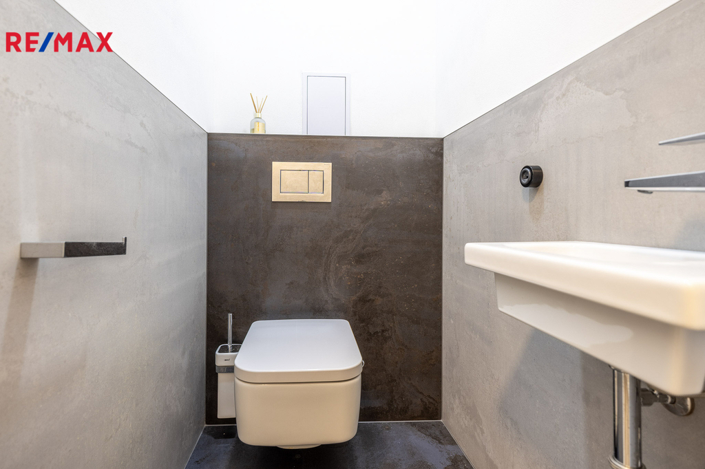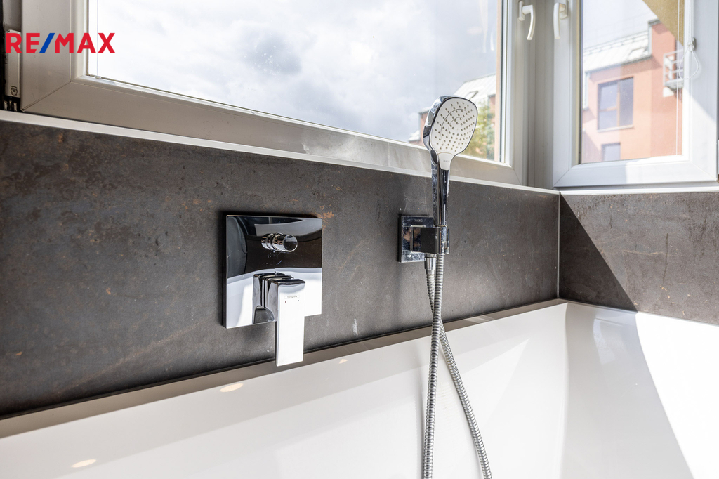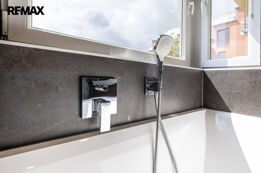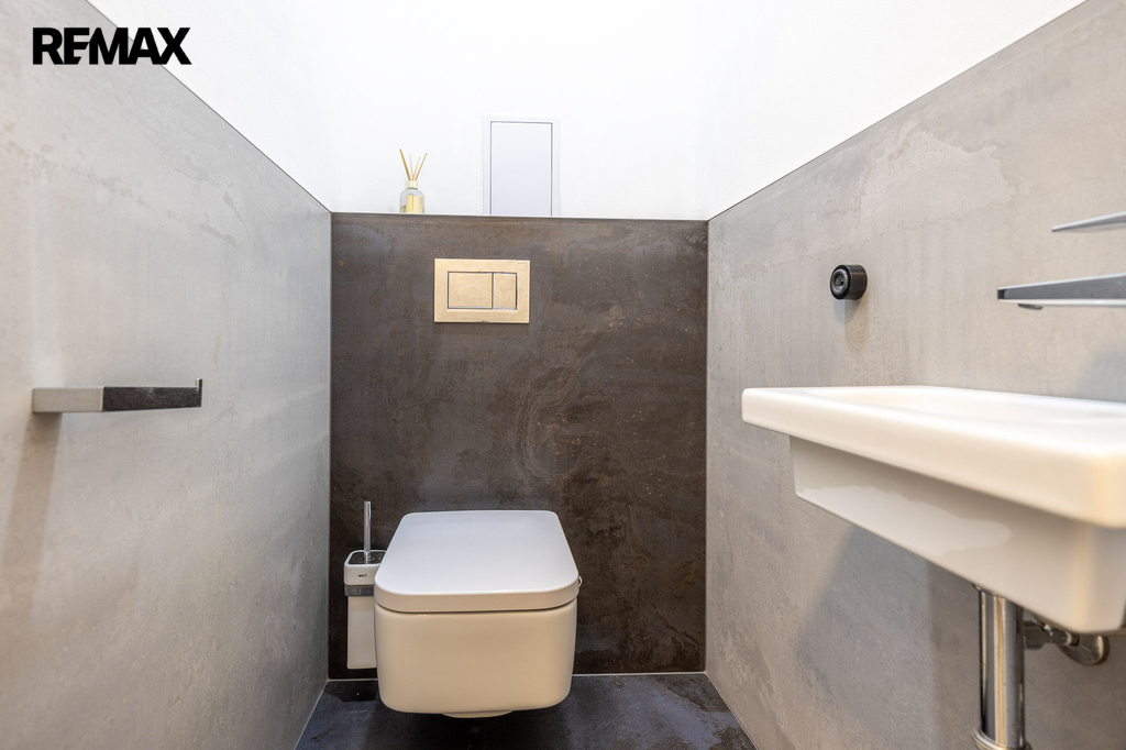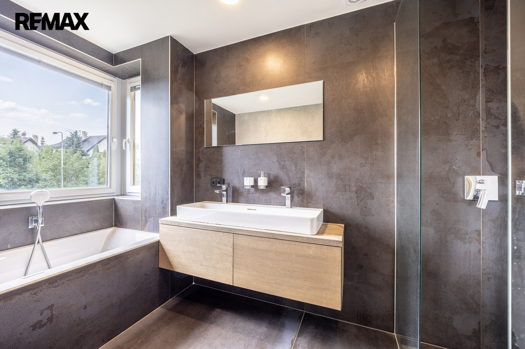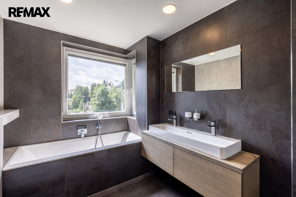 Koupelna kombinuje vanu, sprchový kout a WC a byla vybavena velkoformátovými obklady a dlažbou značky Villeroy & Boch. K dispozici je také samostatné WC a praktická technická místnost.
