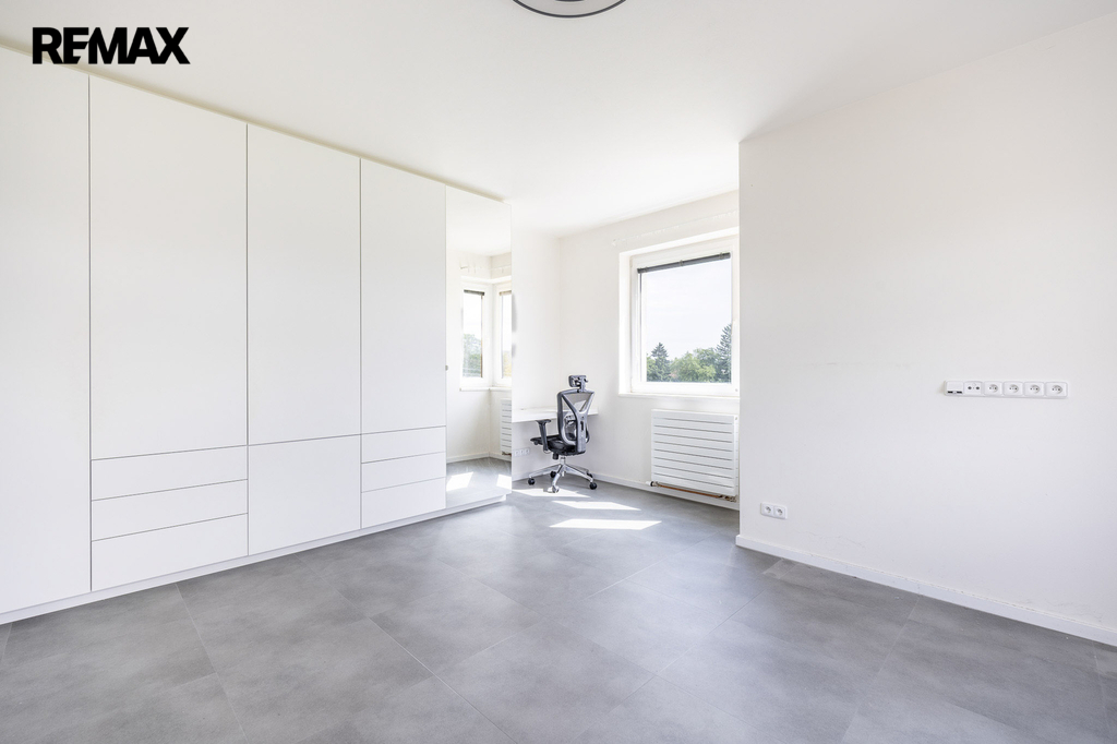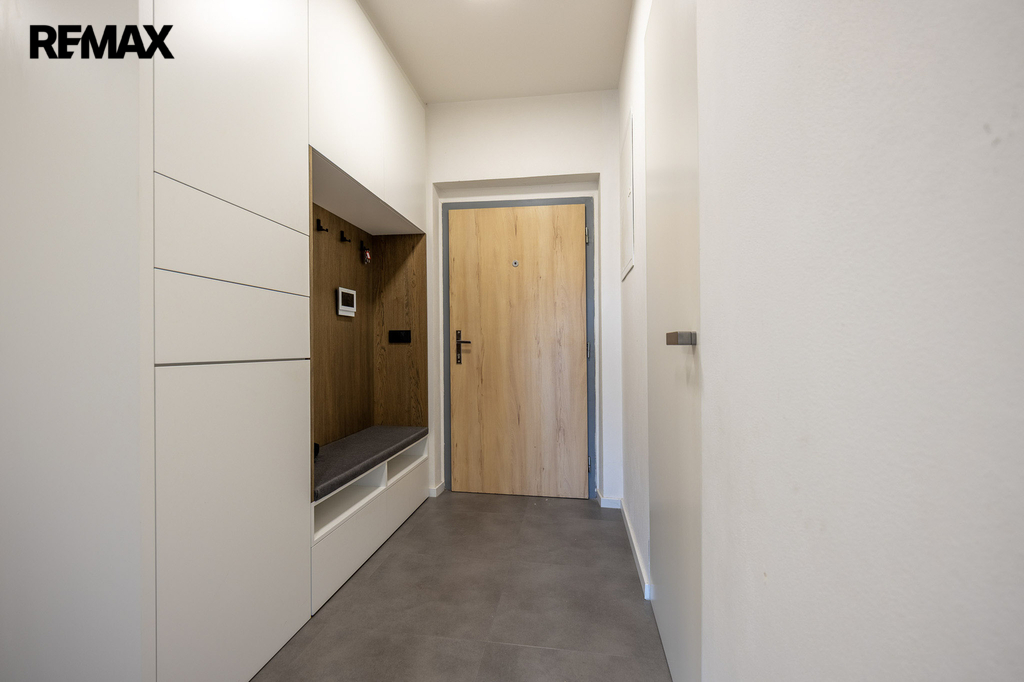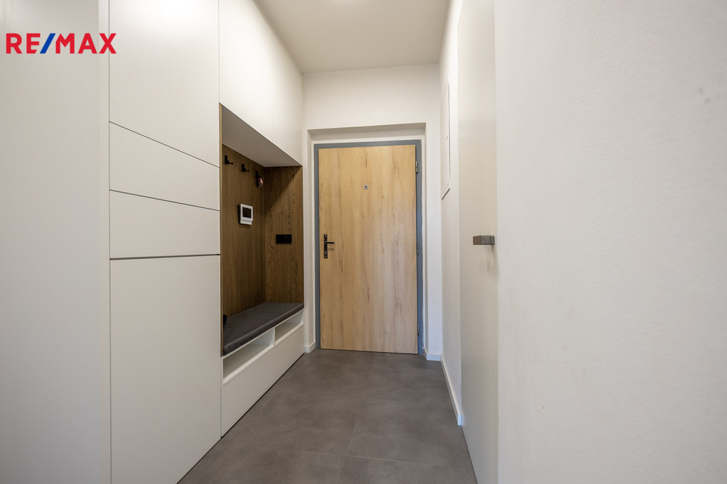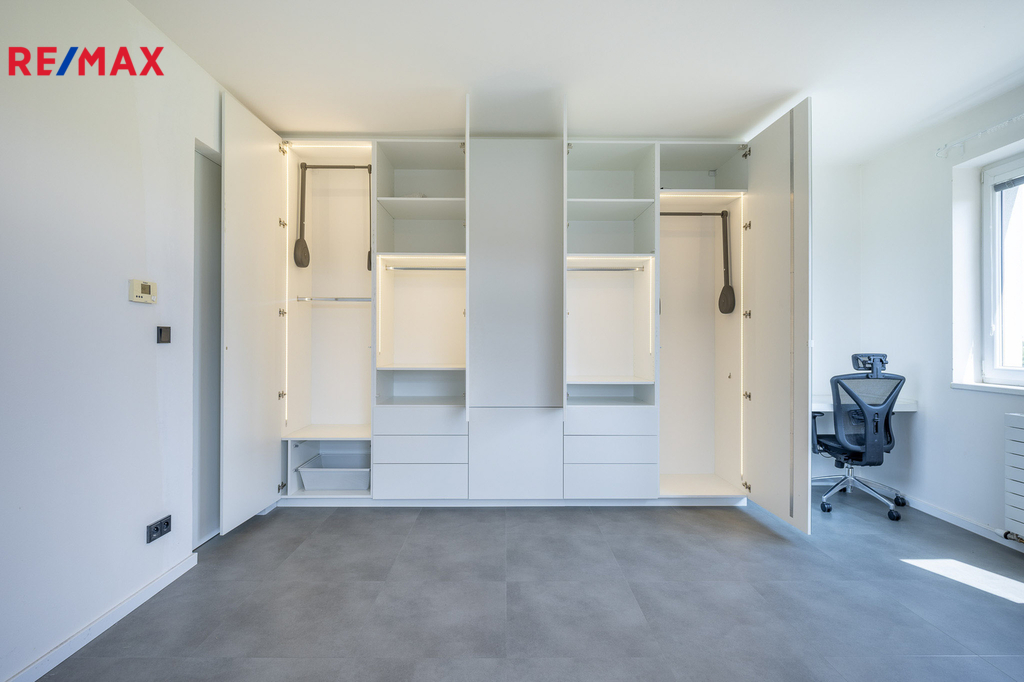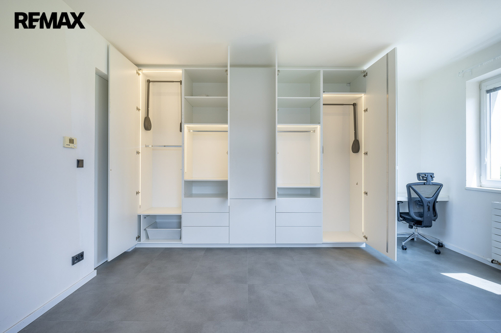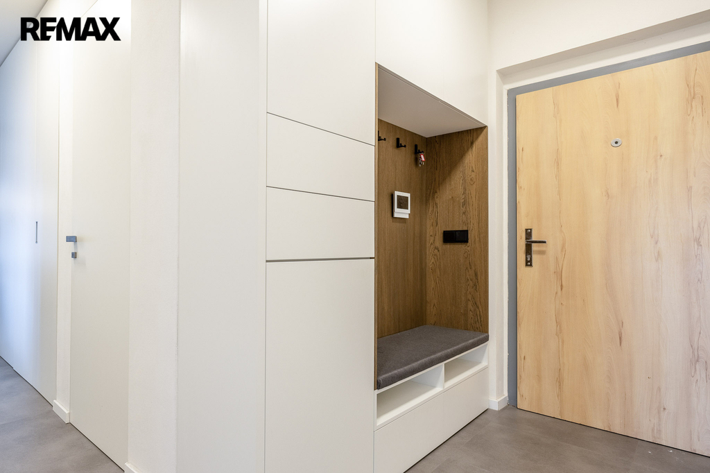 Byt nabízí dostatek úložného prostoru – na chodbách, v ložnici s vestavěnou podsvícenou šatní skříní a také ve sklepní kóji.