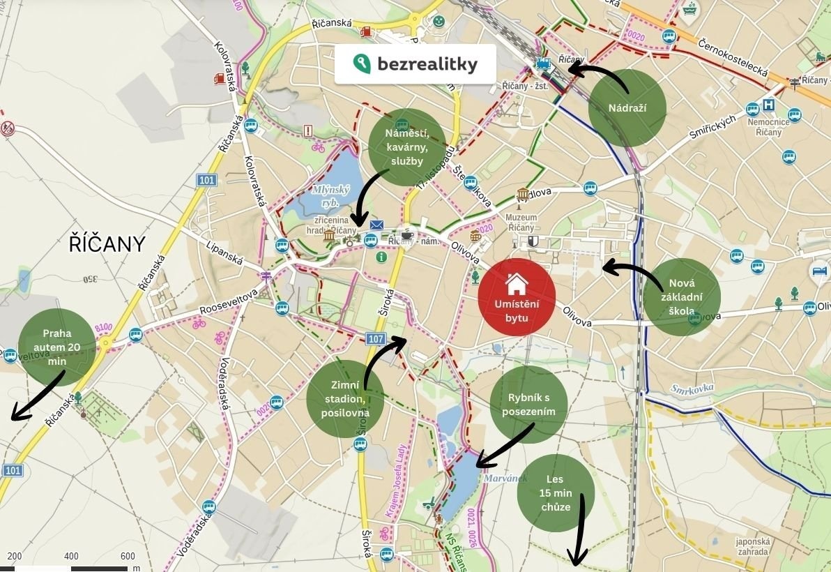 - Do 10–15 minut chůze lesy, přírodní stezky, dětská hřiště, cyklotrasy a rekreační místa, rybník Marvánek, Jureček, říčanský les nebo zřícenina hradu