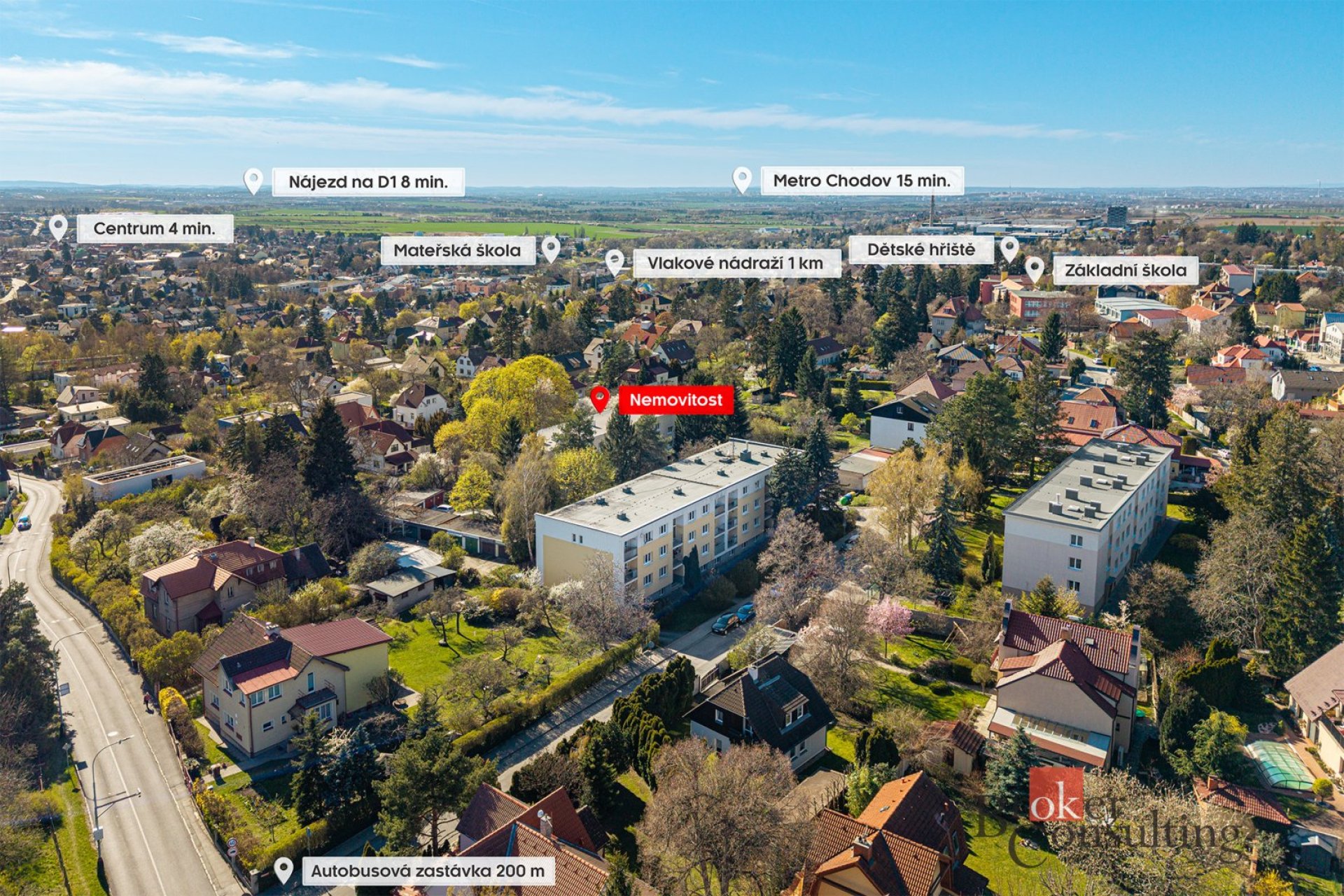 Byt je situován v klidné a příjemné lokalitě s dostatkem zeleně, zároveň však nabízí výbornou dostupnost do centra Prahy, což z něj činí ideální kombinaci klidného bydlení a dobré dopravní dostupnosti. Nemovitost se nachází 10 minut chůze od vlakového nádraží a 5 minut od lesa, který je ideálním místem pro procházky v přírodě. V okolí veškerá občanská vybavenost vč. školy, školky, dětských hřišť, obchodů či restaurací.