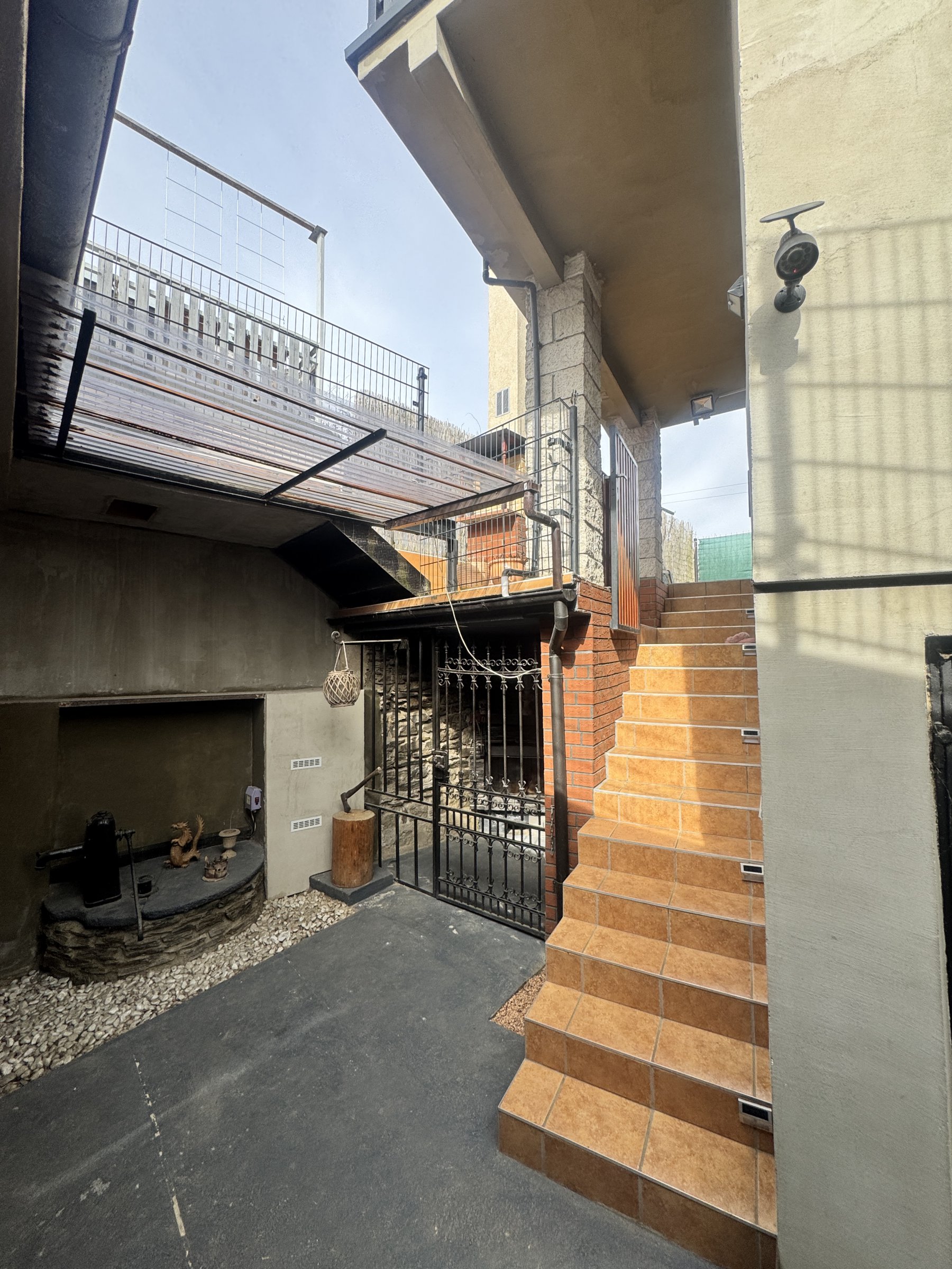 Uzavřený dvůr je ohraničen obvodovým zdivem a poskytuje příjemné soukromí. Je zde umístěna studna a zákoutí s krbem a udírnou.