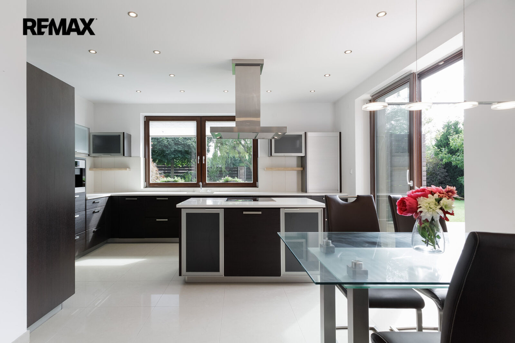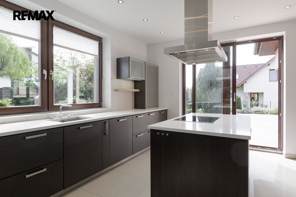 Dominantou celého domu je jeho přízemí. Kuchyň, která je do posledního detailu navržena nábytkem na míru zn. Sykora. Vestavěné spotřebiče zn. Miele jsou samozřejmostí, stejně jako zabudovaný kávovar. Ženy jistě ocení špajz, který ke kuchyni patří.