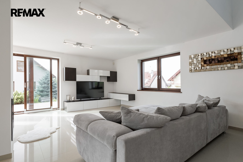 K přízemí patří obývací pokoj s na míru vyrobenou obývací stěnou. Plynový krbe, Vás v chladnějších měsících nejen zahřeje, ale působí v celém prostoru skvěle. Velkou výhodou obývacího pokoje a kuchyně je vstup na terasu, kde můžete u venkovního grilu s komínem posedět s přáteli nebo rodinou, a něco dobrého připravit. Jako pokoj pro hosty nebo pracovna byl vymyšlen prostor, který se nachází u vstupu do domu. Součástí pokoje je šatna. Přízemí disponuje koupelnou se sprchovým koutem a WC. V technické místnosti najdete vše potřebné pro běžný chod domu.