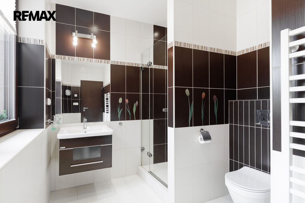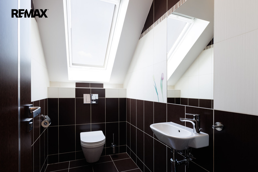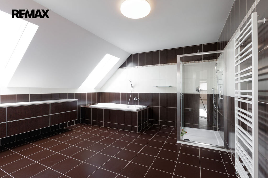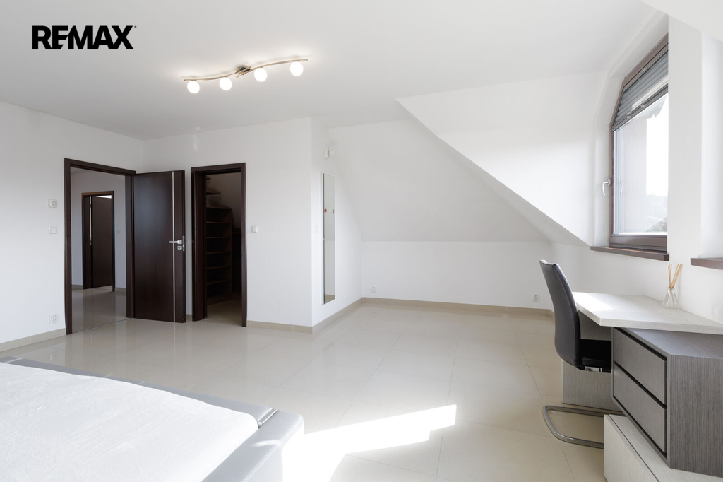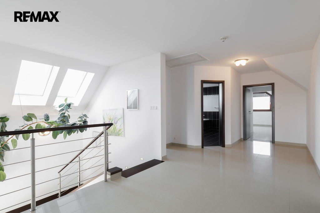 Při stoupání do prvního patra se nám nabídne prostorná chodba se vstupy do 3 ložnic, z nichž jedna z nich lze rozdělit na dva samostatné pokoje. Součástí každé ložnice je šatna s úložným prostorem. V prvním patře najdeme další koupelnu, tentokrát s vanou i se sprchovým koutem, dále pak samostatné WC.