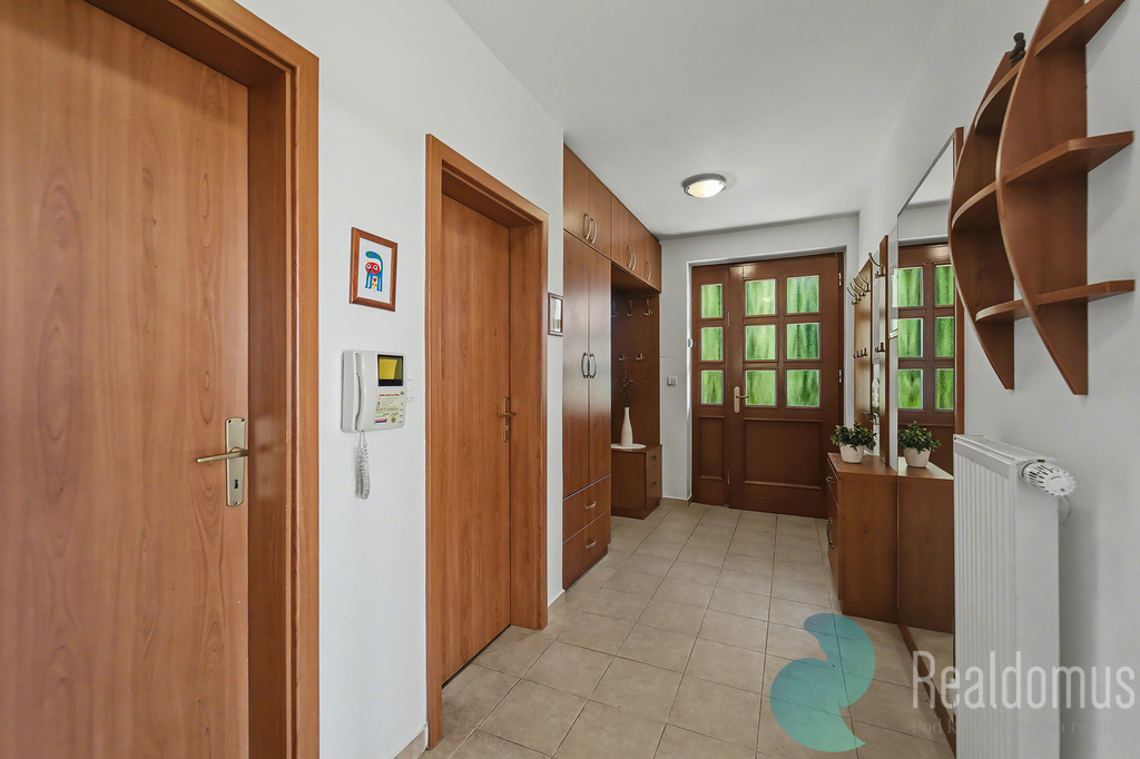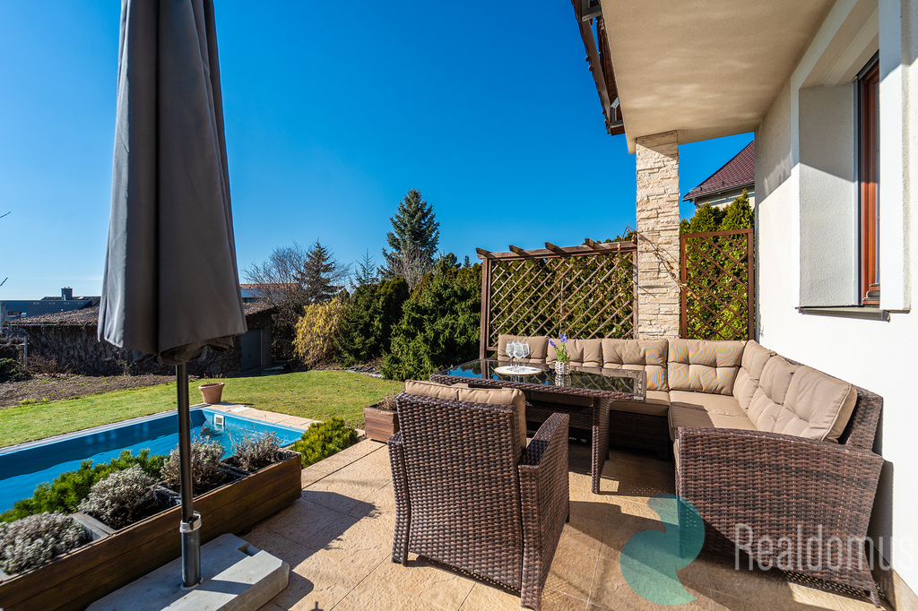 Dominantou domu je velkorysá terasa s krbem (25 m²), která plynule propojuje interiér se zahradou a krytým vyhřívaným bazénem (25 m²). V letních měsících terasa poskytuje plnohodnotný obytný prostor pro odpočinek, rodinná setkání i večery s přáteli. Z balkonu v patře i z terasy v přízemí se navíc otevírá krásný výhled do širokého okolí, jakých v Říčanech mnoho nenajdete.