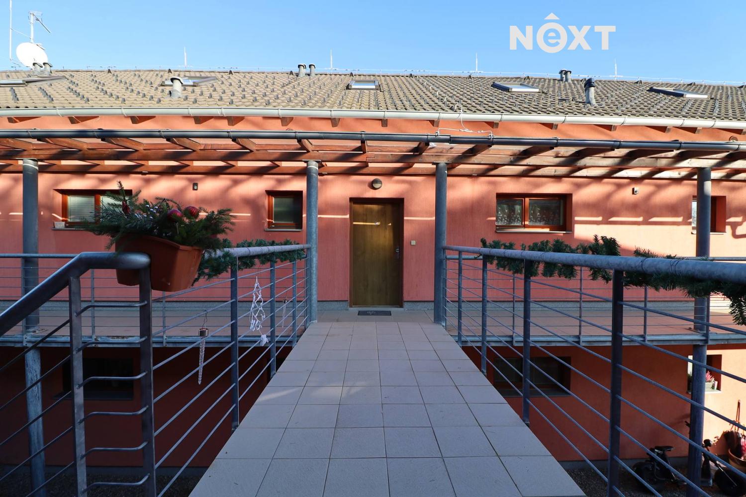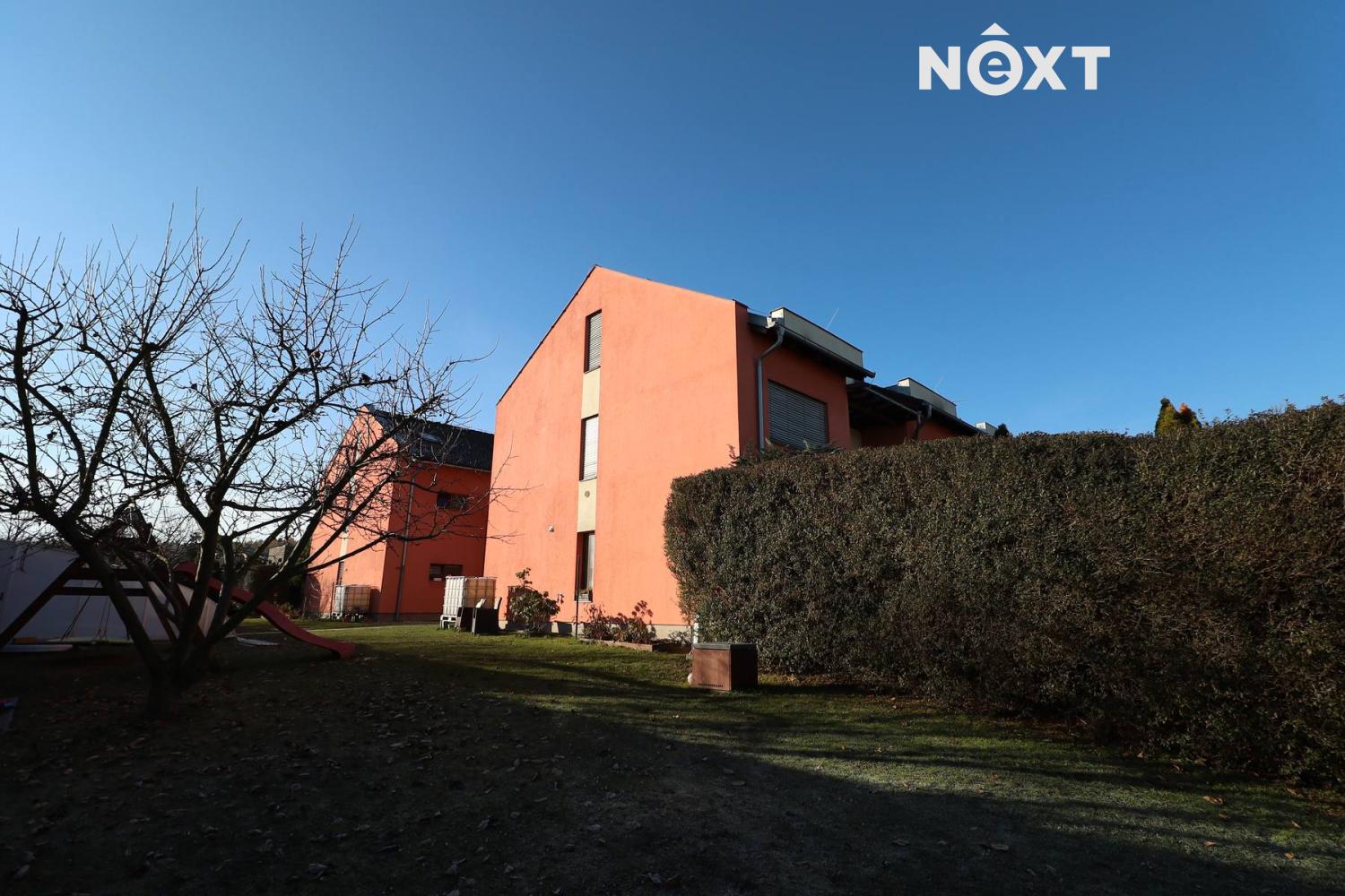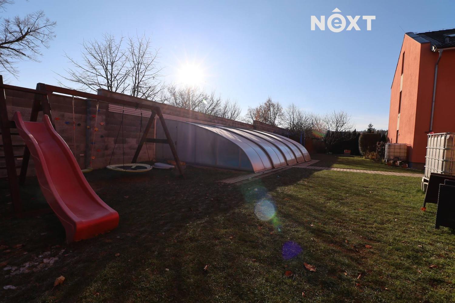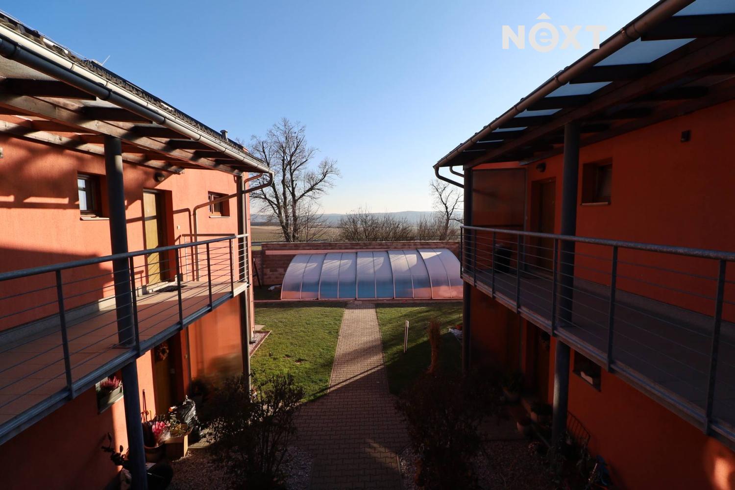 Byt je součástí dvou domků, které vytvářejí útulný dvorek. Cestička lemovaná okrasnými keři vás zavede k blankytnému bazénu. Vedle něj najdete houpačky, klouzačku, pískoviště, trampolínu i pergolu se zahradním posezením, grilem a lednicí – ideální místo pro sousedská setkání. Vytápění bytu díky společnému plynovému kotli pro daný objekt.