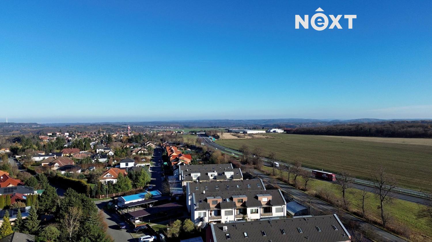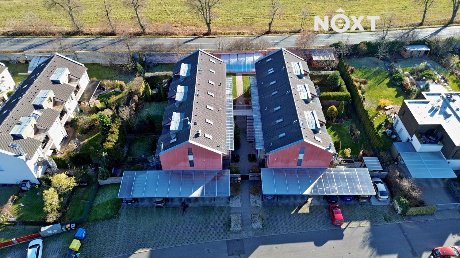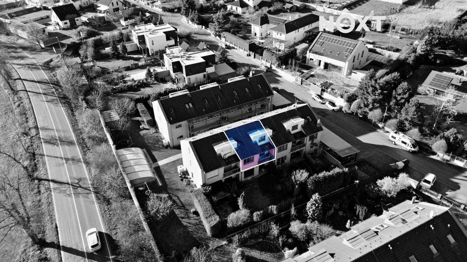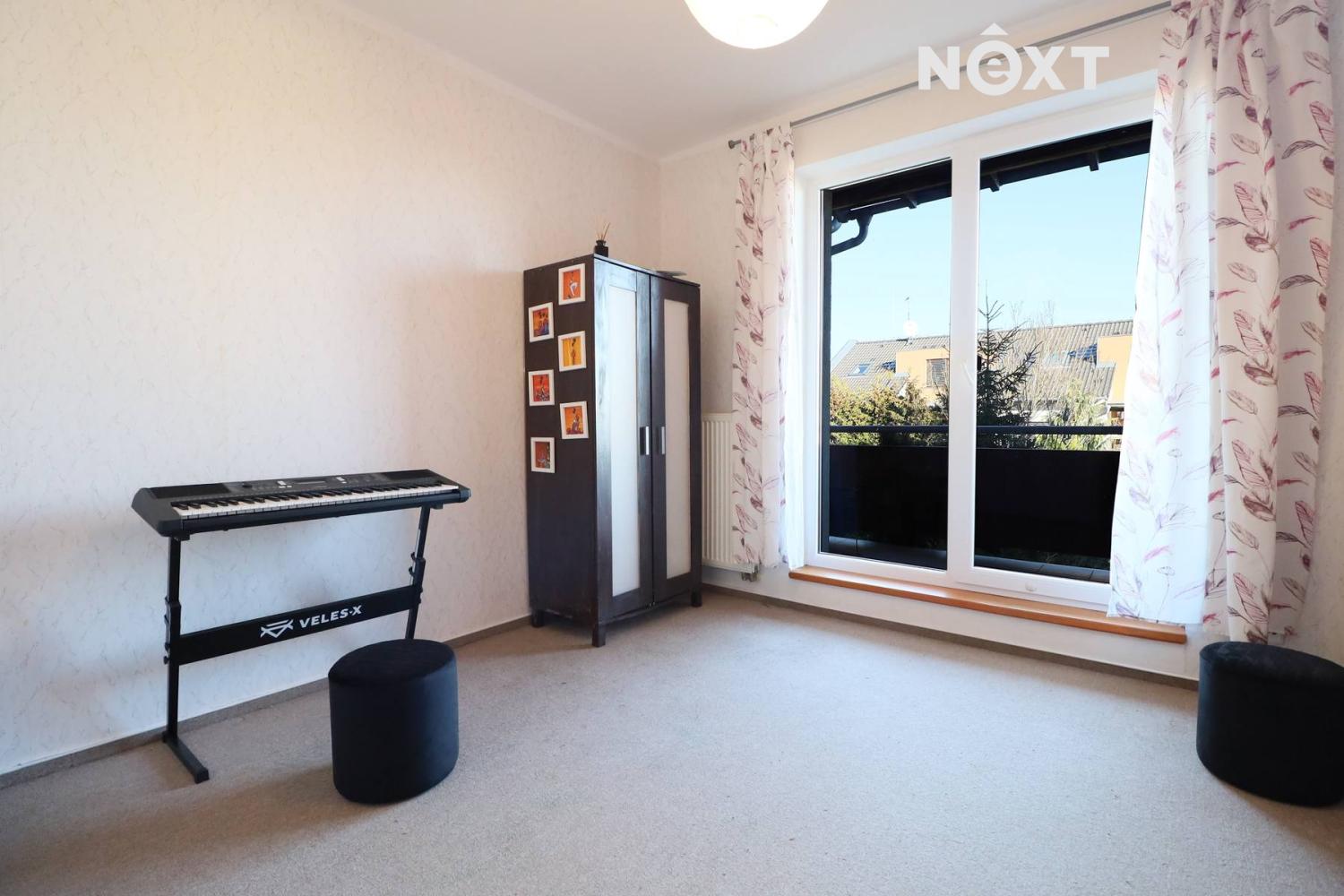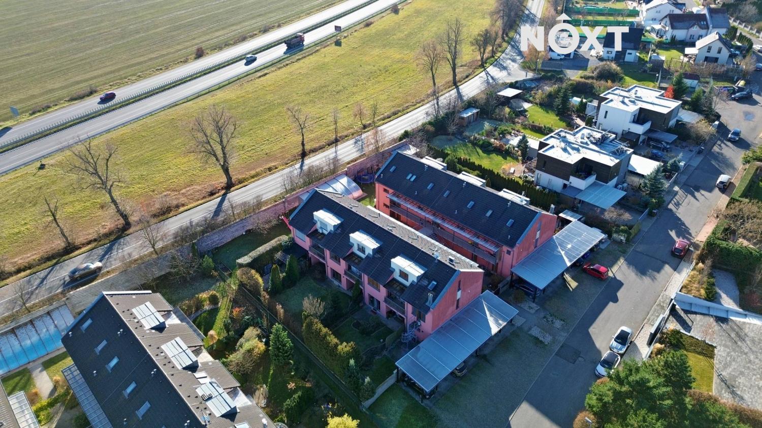 Byt je součástí dvou domků, které vytvářejí útulný dvorek. Cestička lemovaná okrasnými keři vás zavede k blankytnému bazénu. Vedle něj najdete houpačky, klouzačku, pískoviště, trampolínu i pergolu se zahradním posezením, grilem a lednicí – ideální místo pro sousedská setkání. Vytápění bytu díky společnému plynovému kotli pro daný objekt.